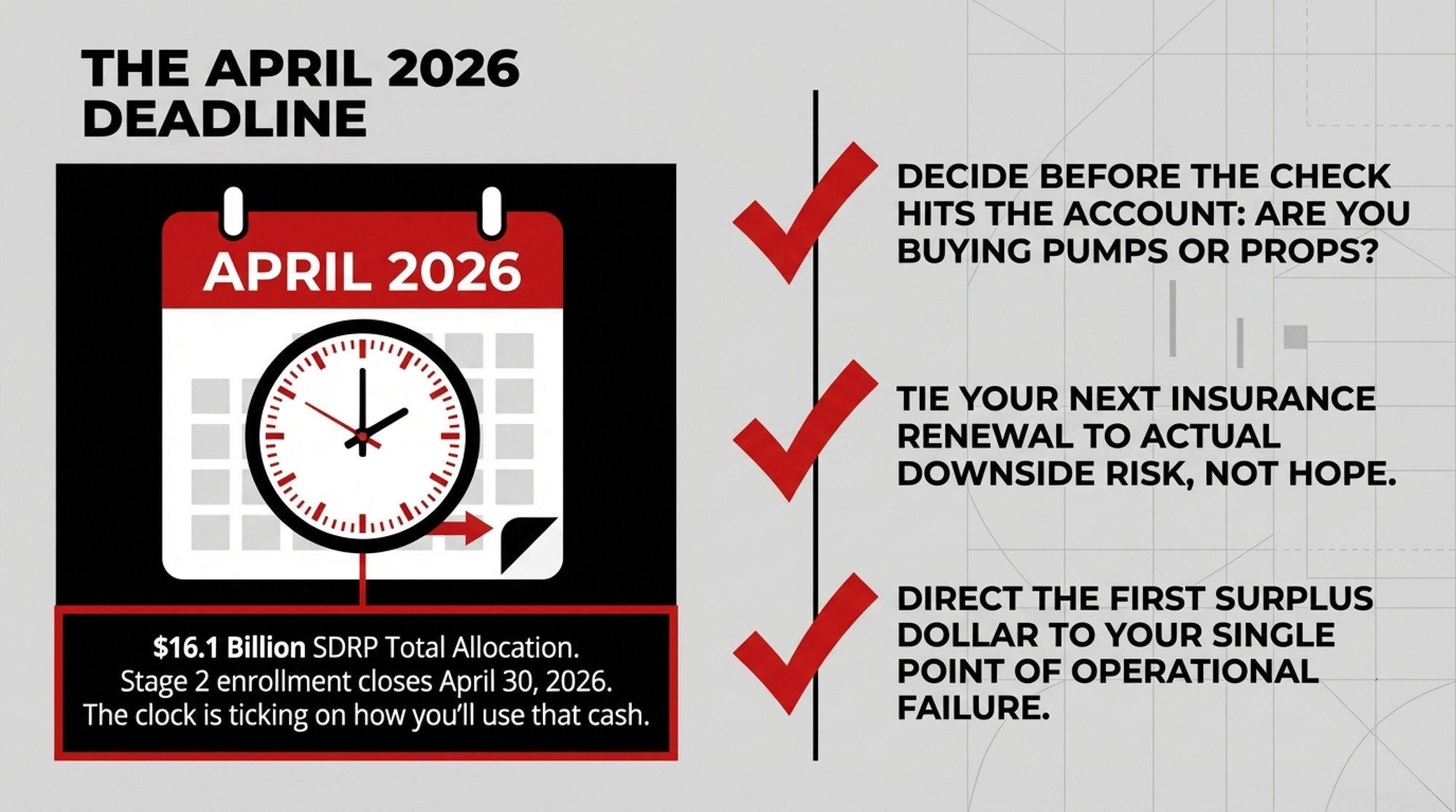 Risk/limit: Tough in the moment to put conditions on “free” money. But this is how you avoid a business model that only works if Congress or Parliament keeps saying yes. SDRP Stage 2 is open until April 30, 2026; the clock is ticking on how you’ll use that cash — for pumps or for props.