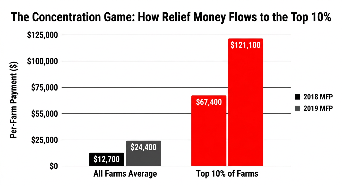 A study by Eric Belasco and Vincent Smith at Montana State University, published in Food Policy in 2021 and widely cited by AEI, examined the 2018 and 2019 Market Facilitation Programs. The largest 5% of farms received 34.3% of total MFP payments in 2018 and 32.1% in 2019. Under the 2018 MFP, the largest 10% of farms received per‑farm payments roughly five times the overall average: about $67,400 vs. $12,700. Under the 2019 MFP, the gap was $121,100 vs. $24,400 (Belasco & Smith, Food Policy, 2021, Tables 2 and 3).