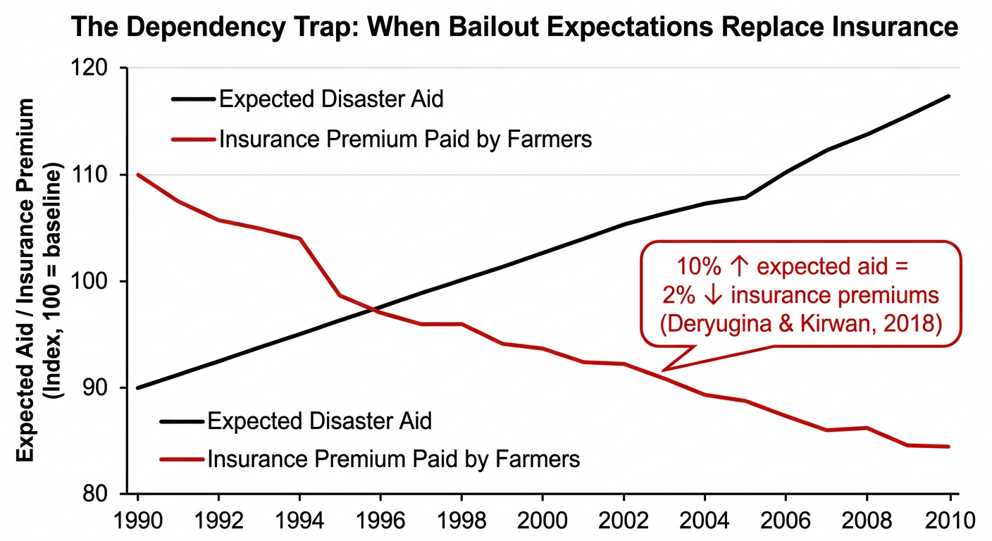 But something else happens underneath the relief. Research by Tatyana Deryugina and Barrett Kirwan, published in Economic Inquiry in 2018 and first released as NBER Working Paper 22845 in 2016, dug into U.S. crop data from 1990 to 2010 — a stretch when Congress provided ad hoc disaster payments every single year. They found that when farmers expect more disaster aid, they pull back on their own protection. A 10% increase in expected disaster payments was associated with about a 2% reduction in insurance premiums farmers actually pay, and farmers shifted toward less generous coverage when they assumed someone would bail them out.