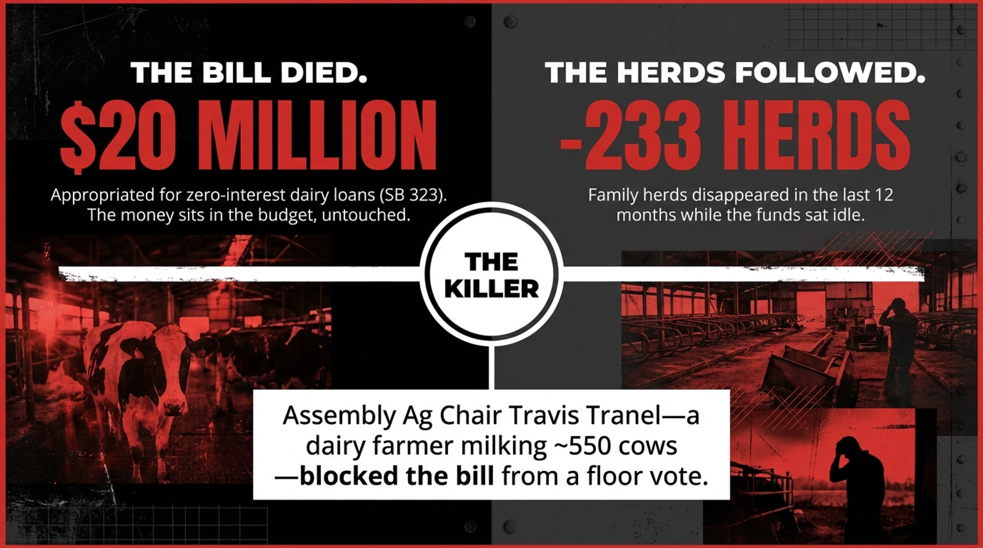 The man who didn’t bring the bill forward? Assembly Agriculture Committee Chair Travis Tranel, a sixth-generation dairy farmer who milks around 550 cows near Cuba City in Grant County, is currently serving his eighth term. A dairy farmer killed a bill to modernize dairy farms. That’s the part nobody’s talking about.