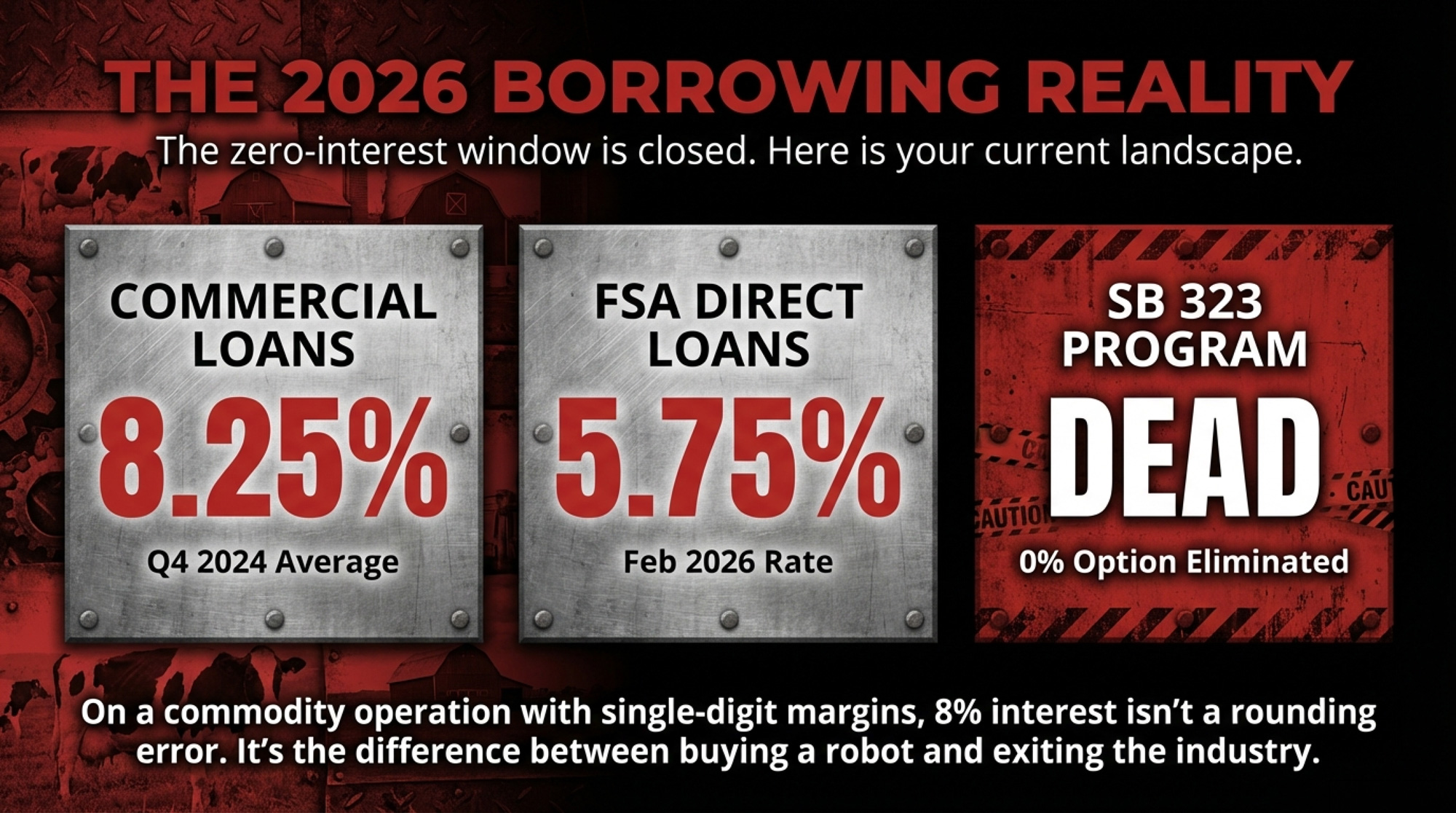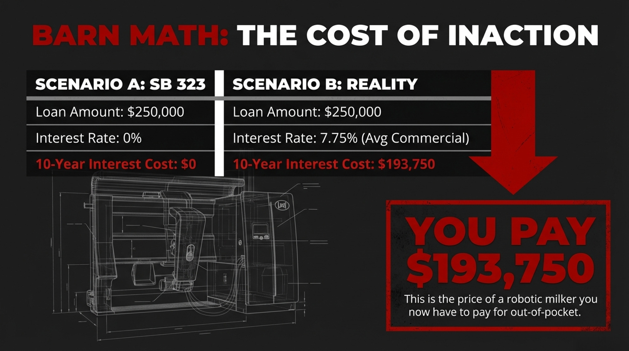 The question SB 323 tried to answer: what if you could make that 150-cow farm efficient enough to hand to your kid? Zero-interest financing for a robotic milker or a precision feeder was one way to get there. That option is gone for at least another year.