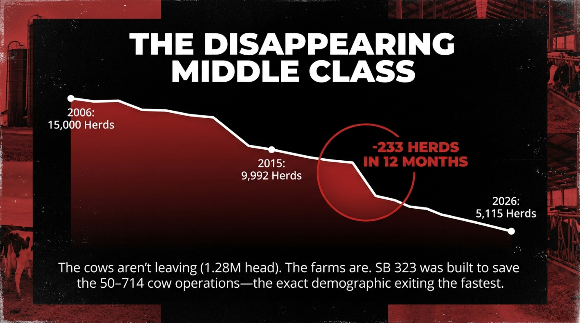 The cows haven’t left. Wisconsin still milks 1.28 million head (DATCP, 2026). Production hit record highs. What’s left is fewer, bigger operations, and a disappearing middle class of dairy farms that SB 323 was specifically built to serve.