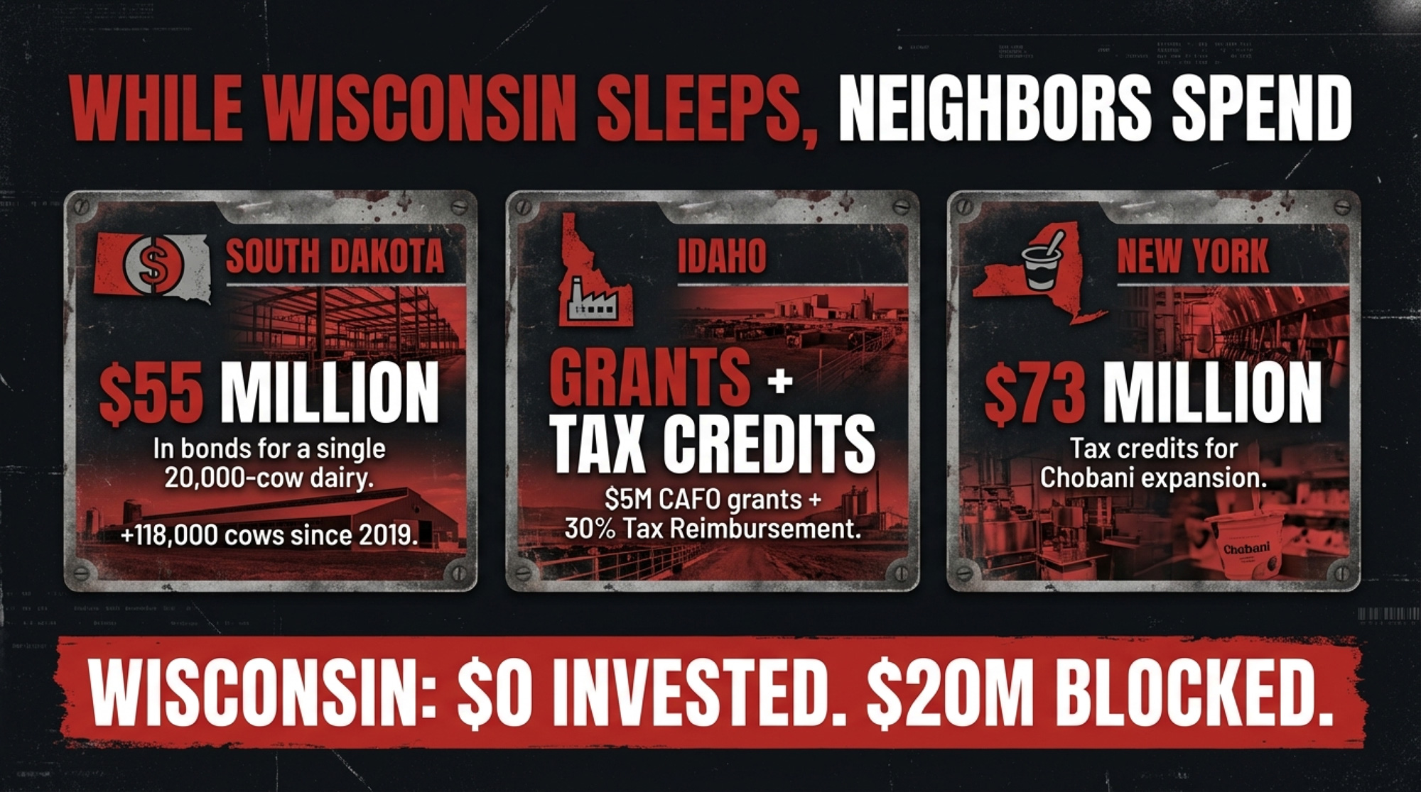 Wisconsin offered $20 million in zero-interest loans to farms under 700 cows — and couldn’t get it through its own Ag Committee. South Dakota approved $55 million in bonds for a single 20,000-cow mega-dairy. That’s the competitive math right now.