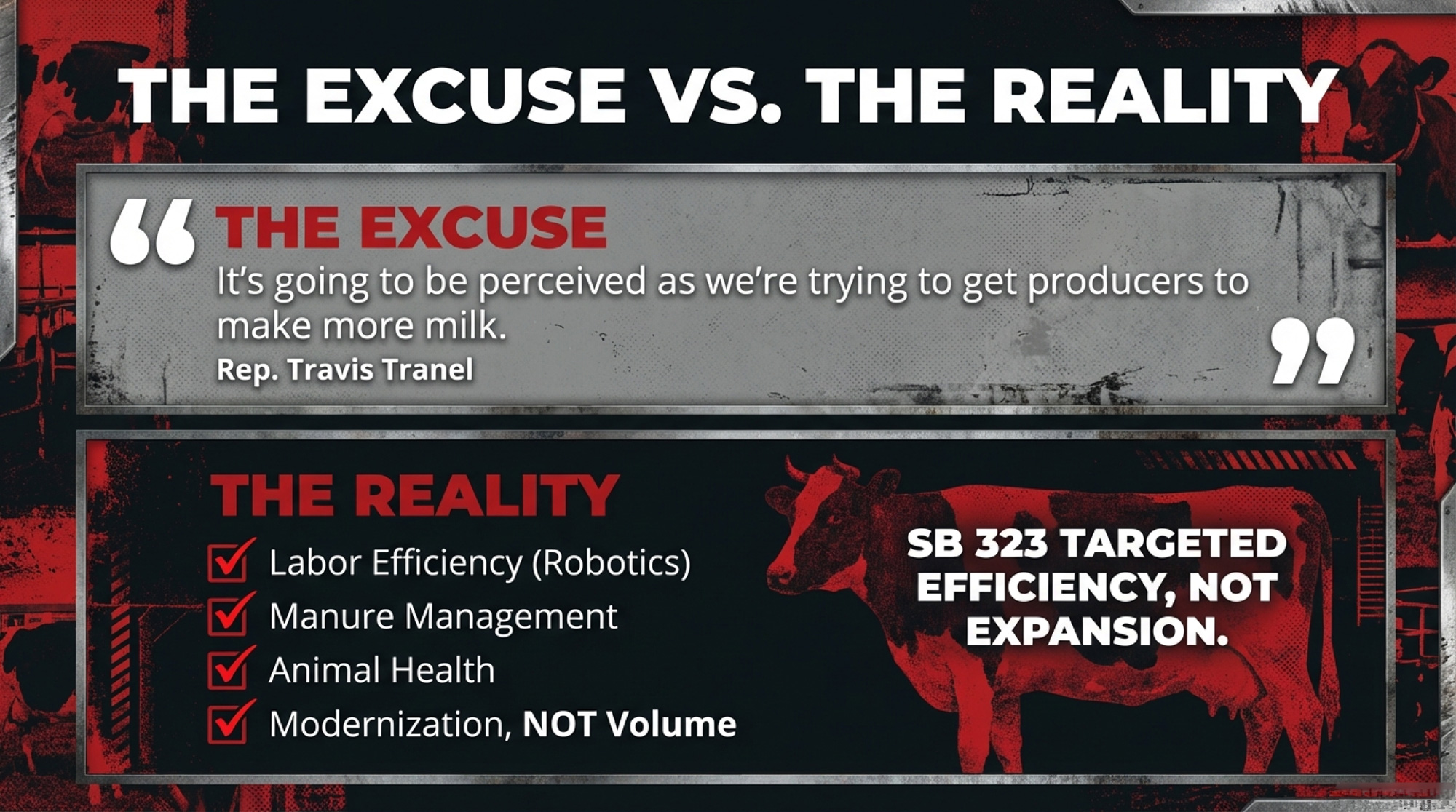 And his stated objection — that financing equipment modernization “is going to be perceived as we’re trying to get producers to make more milk” — doesn’t survive contact with the bill text. SB 323’s priority criteria emphasized labor efficiency, manure management, reduced environmental impact, and animal health. Production volume wasn’t a stated goal. Efficiency was.