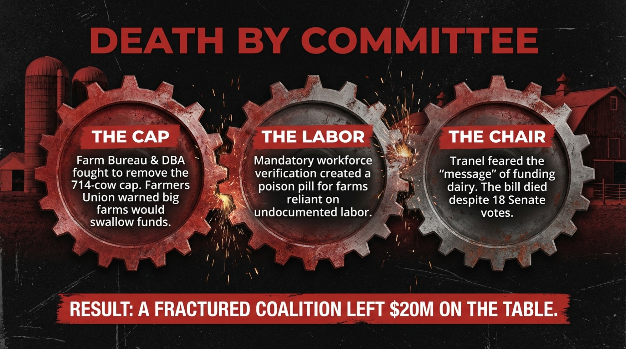 SB 323 cleared the Senate Agriculture and Revenue Committee 8-0. It passed the full Senate 18-15. In a legislature where dairy bills rarely see that level of bipartisan support, this one had momentum.