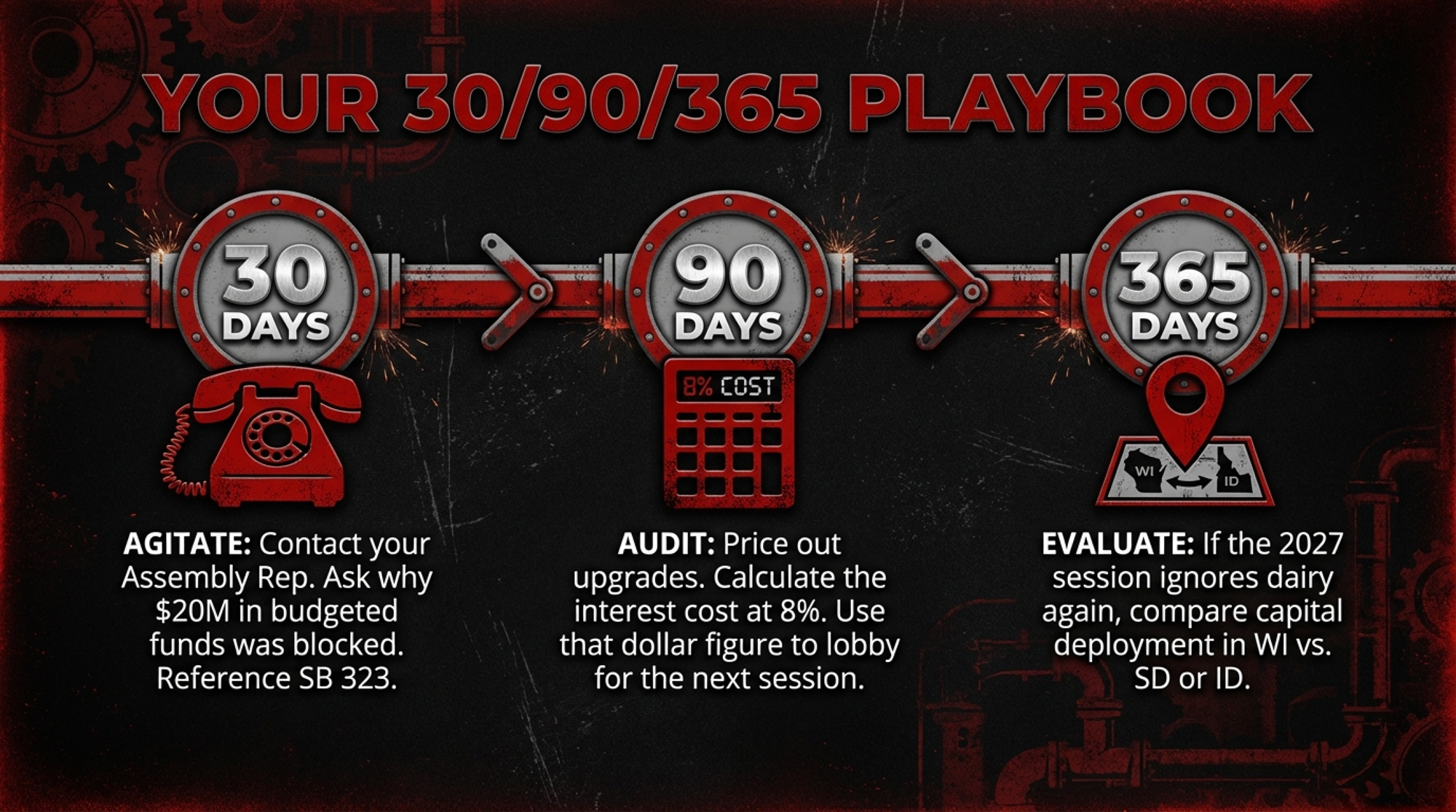 - 365 days: If the bill doesn’t return when the legislature reconvenes in January 2027, seriously evaluate whether Wisconsin’s policy environment still supports your operation in the long term. South Dakota approved $55 million in bonds for a single dairy last year. Idaho is handing out CAFO improvement grants. Other states are making investment decisions in real time — and some of them are investing in your competitors.