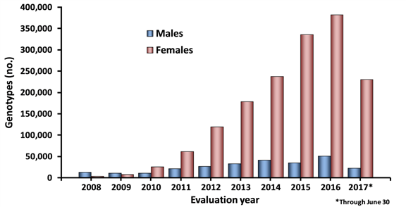 Use of an animal’s genotype – or genetic makeup – to predict future performance started in 2008, when the first U.S. Holstein sires were genotyped. Since 2008, the U.S. genotype database has grown tremendously and is the largest in the world, including genotypes for 278,984 males and 1,662,922 females from the five largest dairy breeds, as of July 10. In 2016 alone, nearly half a million genotypes were submitted to the Council on Dairy Cattle Breeding (CDCB).