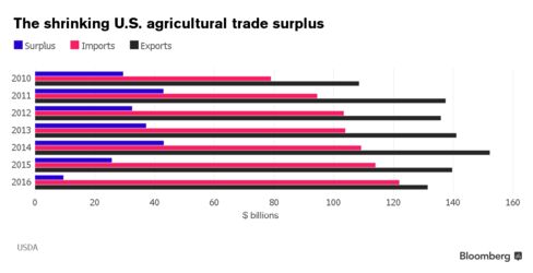 In the 12 months ending Sept. 30, U.S. shipments of grain, soybeans, cotton, meat and other farm products will fall 5.9 percent to $131.5 billion amid “strong competition” from global producers and weaker Chinese demand, the Department of Agriculture said Tuesday in a report. U.S. agricultural imports will climb 7 percent to a record $122 billion. That puts the surplus at $9.5 billion, the lowest since 2006. The August forecast was $16 billion.