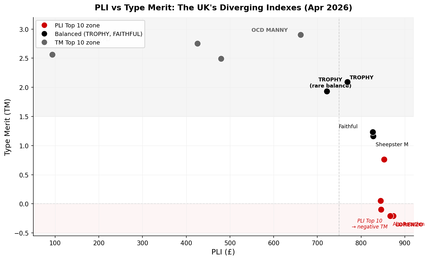 The Type Merit genomic list runs on entirely different logic than PLI, and April 2026 makes that divergence impossible to ignore. OCD MANNY debuted at #1 with a +2.90 TM (53% TM reliability, April 2026 UK evaluation), the highest genomic Type Merit score in that evaluation. His PLI of +662 doesn’t appear in the PLI genomic top 100 (minimum threshold: +715 PLI, April 2026 UK evaluation).