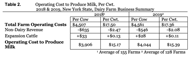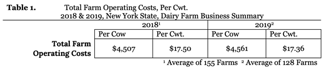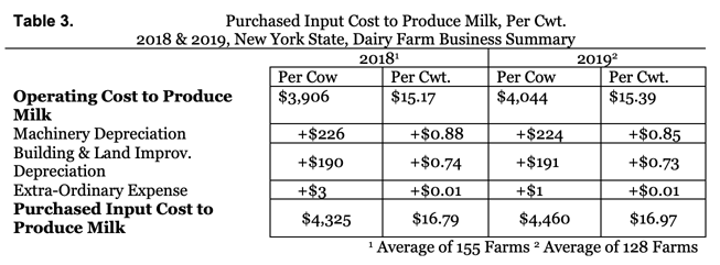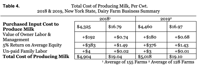 Table 4 highlights the changes for 2018 and 2019 to move from Purchased Input Cost to Produce Milk to Total Cost of Producing Milk.