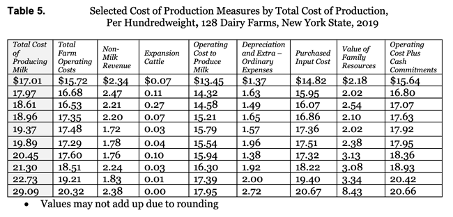 The costs that have to be covered by the milk price determine the break-even point, or price. The challenge becomes what to include, or not include, to determine what those costs may be. Several different measures of cost of production can be calculated for your farm, each with different implications. The following discussion highlights different costs of production, utilizing data from the Dairy Farm Business Summary and Analysis Program to show averages and ranges for both 2018 and 2019.