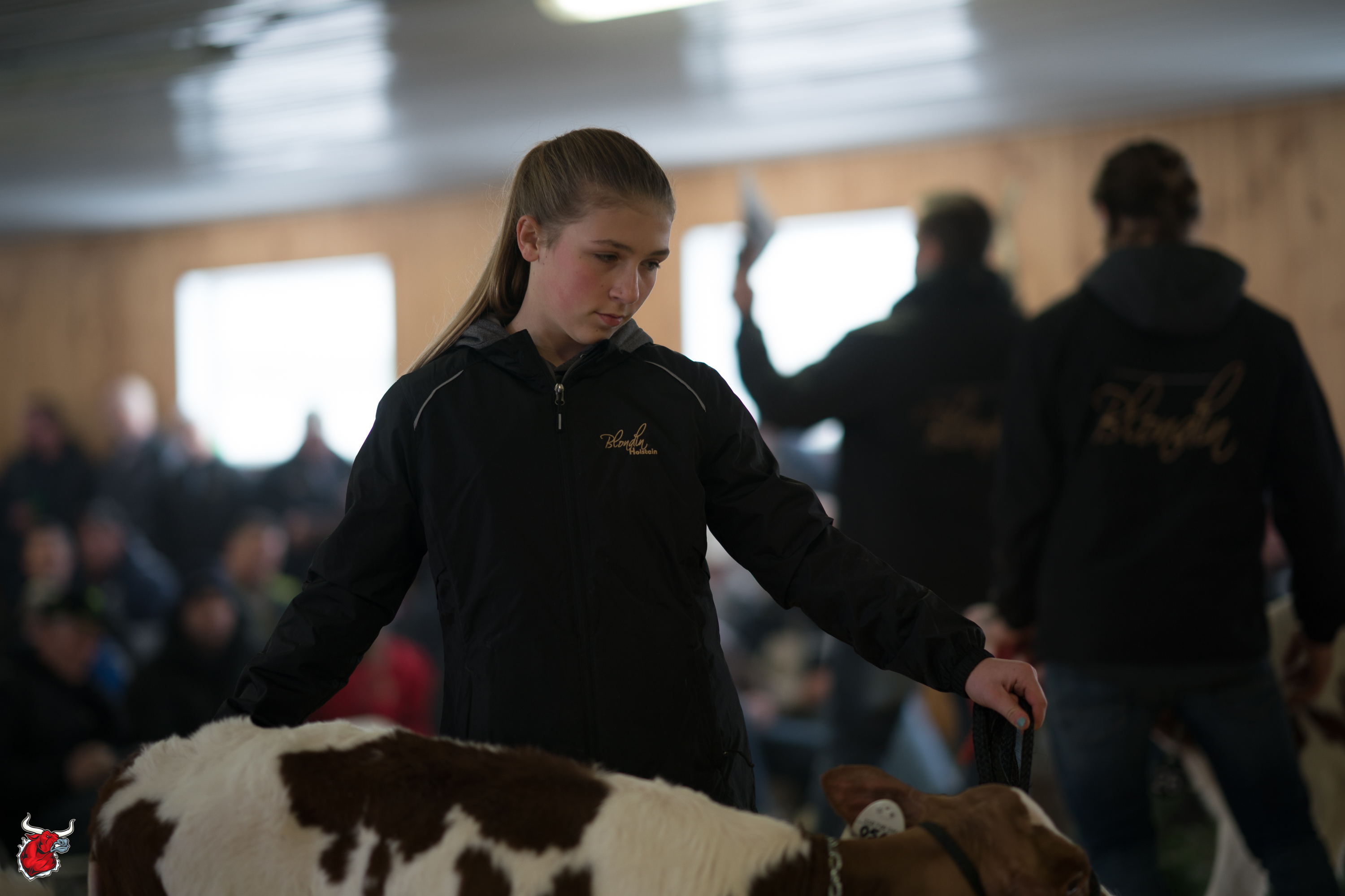 Despite heavy snow weather, a large crowd was on hand at ferme Blondin as they say goodbye to longtime herd manager Richard Villeneuve, who has decided to pursue other endeavours. Villeneuve was also a partner in many of their top show animals, and those animals plus some select partner consignments where sold. The sale averaged $9097 on over 100 live lots.