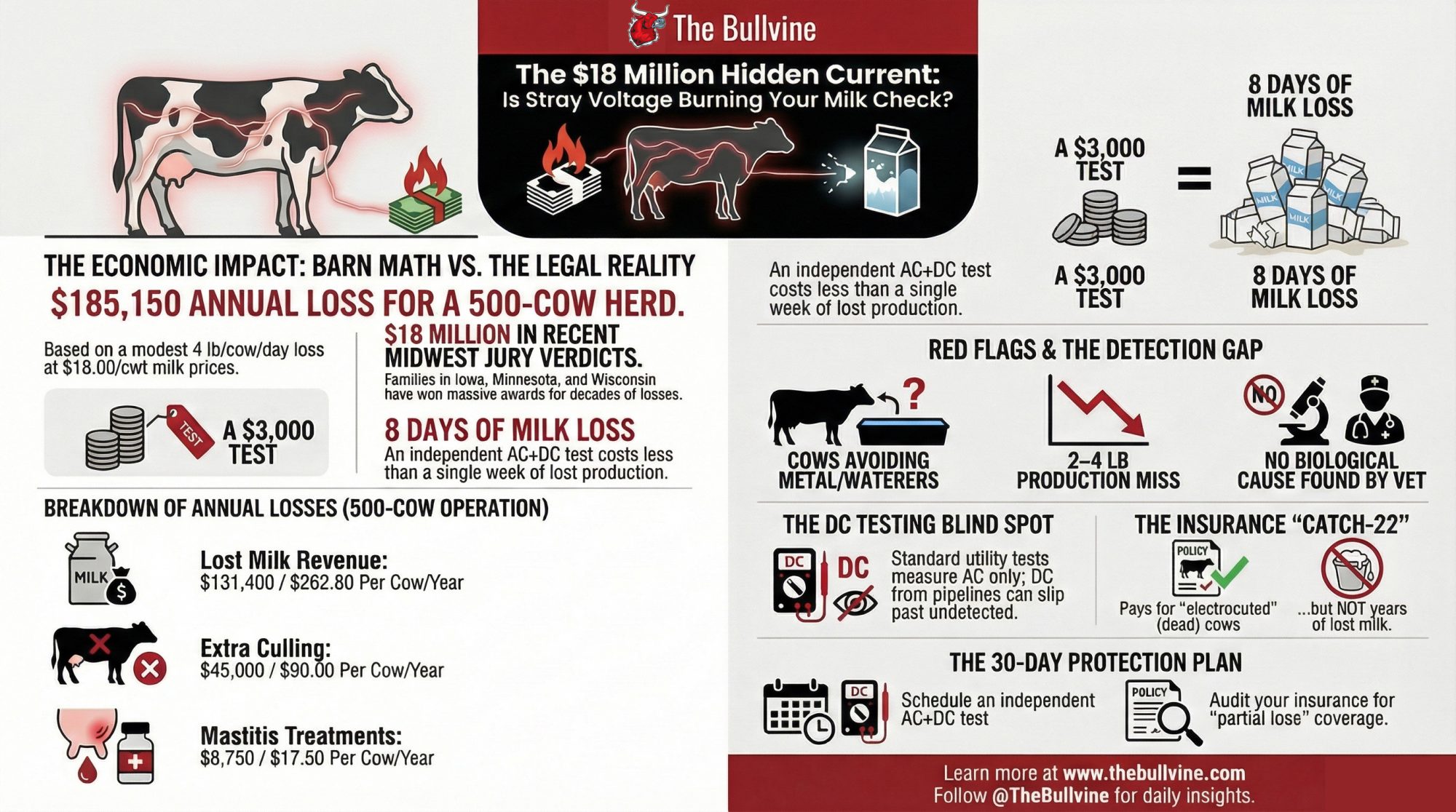 Executive Summary: Three Upper Midwest dairies have already won more than $18 million in stray‑voltage verdicts, and the barn‑math says a hidden 4 lb/cow/day loss on a 500‑cow herd can quietly burn about $185,000/year off your milk check. The article walks through what happened to the Vagts (Iowa), Normans (Minnesota), and Haldersons (Wisconsin) when DC current from utility and pipeline systems ran through concrete barns while standard AC‑only tests kept saying “you’re fine.” It shows how insurance language like “death by electrocution” and “necessary suspension of operations” often pays for dead cows and wiring, but not years of lost milk if you keep milking through the problem. You’ll see exactly when to suspect voltage — cows avoiding one wet metal spot, 2–4 lb/cow/day unexplained loss, and no clear biological cause — and why a low‑thousands‑of‑dollars AC+DC test is basically eight days’ worth of the milk you’re probably already losing. There’s a clear 30‑day plan: schedule an independent DC‑capable test if you see those red flags, email your agent a 4–7 lb/cow/day scenario and ask what actually pays, and start logging production, behavior, and utility work like a future plaintiff. If you’re milking a few hundred cows or more on concrete, especially on older rural lines, this is the kind of “invisible loss” story you read once and then immediately go check your own numbers.
