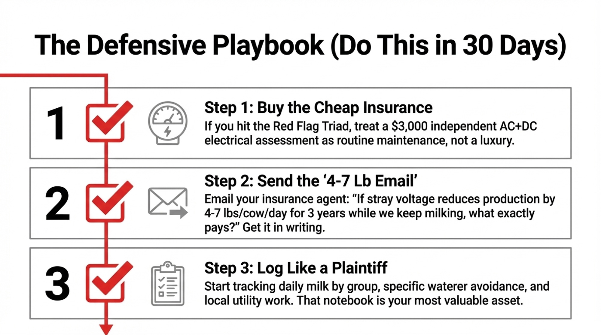 And again, get it in writing. A clean email that says “here’s exactly how your policy would respond if stray voltage quietly took 4 lb/cow/day off your production for three years” is gold if you ever have to argue with a claims adjuster.