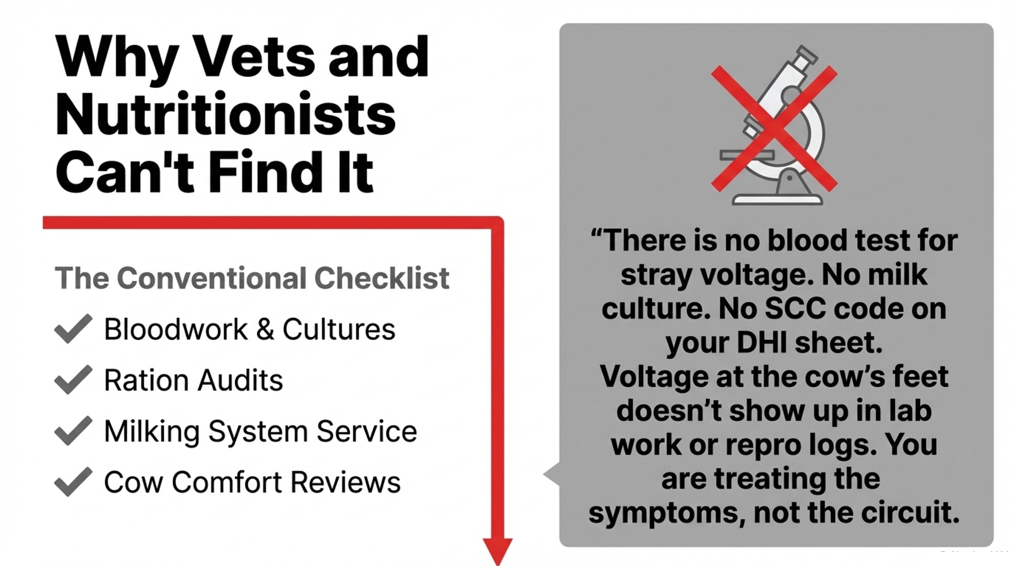 Your vet can see the effects — chronic mastitis, odd behavior, production that doesn’t match the ration — but her toolkit is built to rule out disease, metabolic issues, and management mistakes. Voltage at the cow’s feet doesn’t show up in her lab work. It’s not in your nutritionist’s software. It’s not in your repro logs.