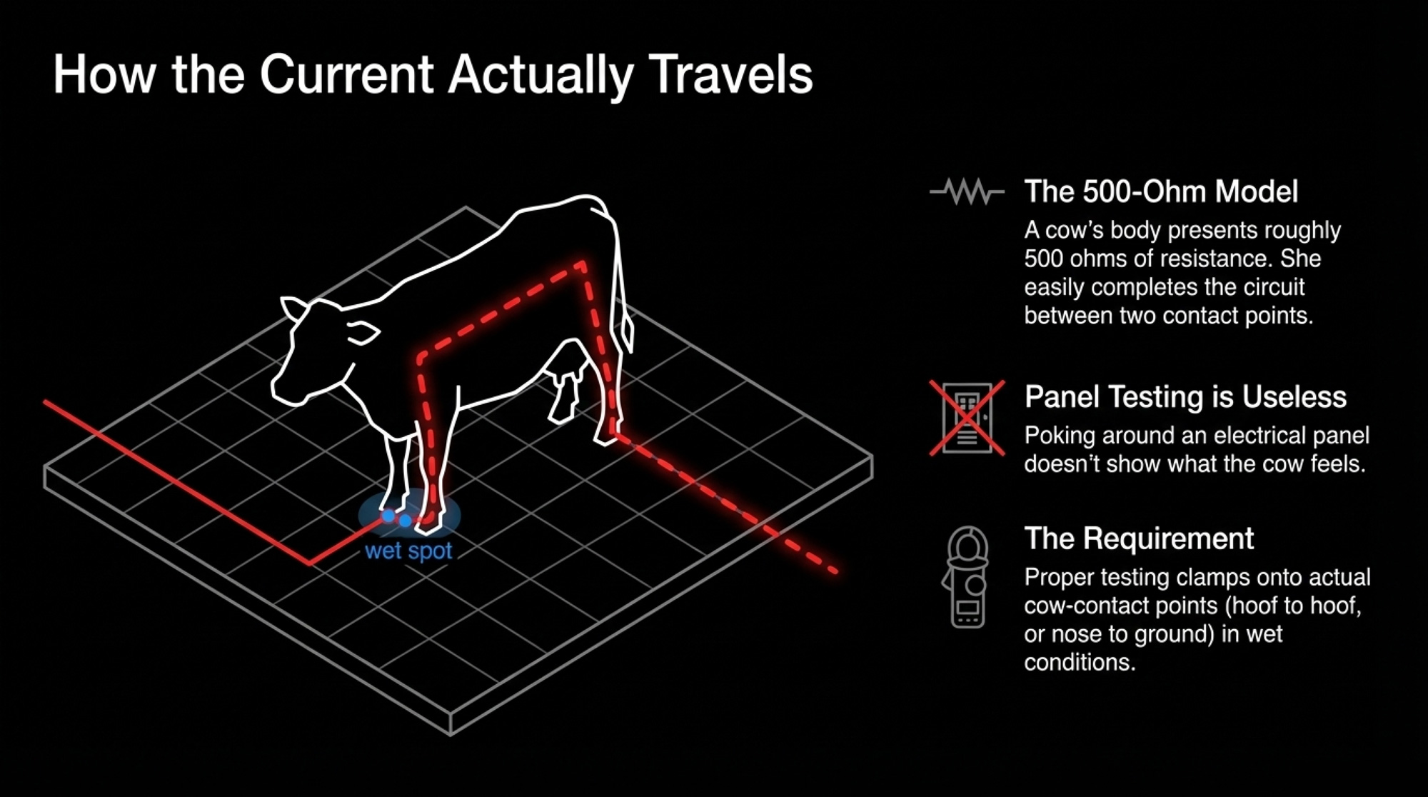 When consultants or PSC documents talk about a “500‑ohm cow model,” they’re just describing how easily a cow completes a circuit through her body — from a front foot in one wet spot to a back foot or nose touching another. The meter stands in for the cow, using about 500 ohms of resistance (roughly what a cow’s body presents), and measures how much voltage really exists from hoof to hoof or nose to ground. That’s why proper testing clamps onto actual cow‑contact points in wet conditions instead of just poking around in the panel.