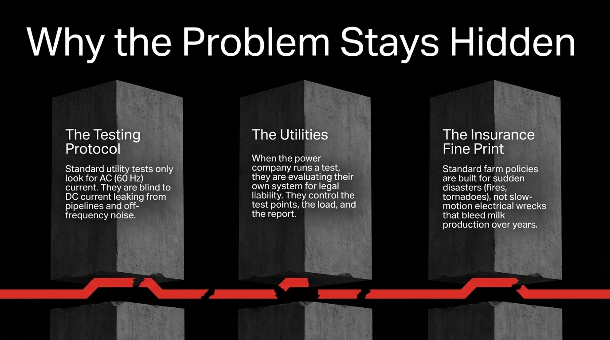 Stray voltage becomes expensive because three systems you rely on — testing, utilities, and insurance — are built with blind spots.