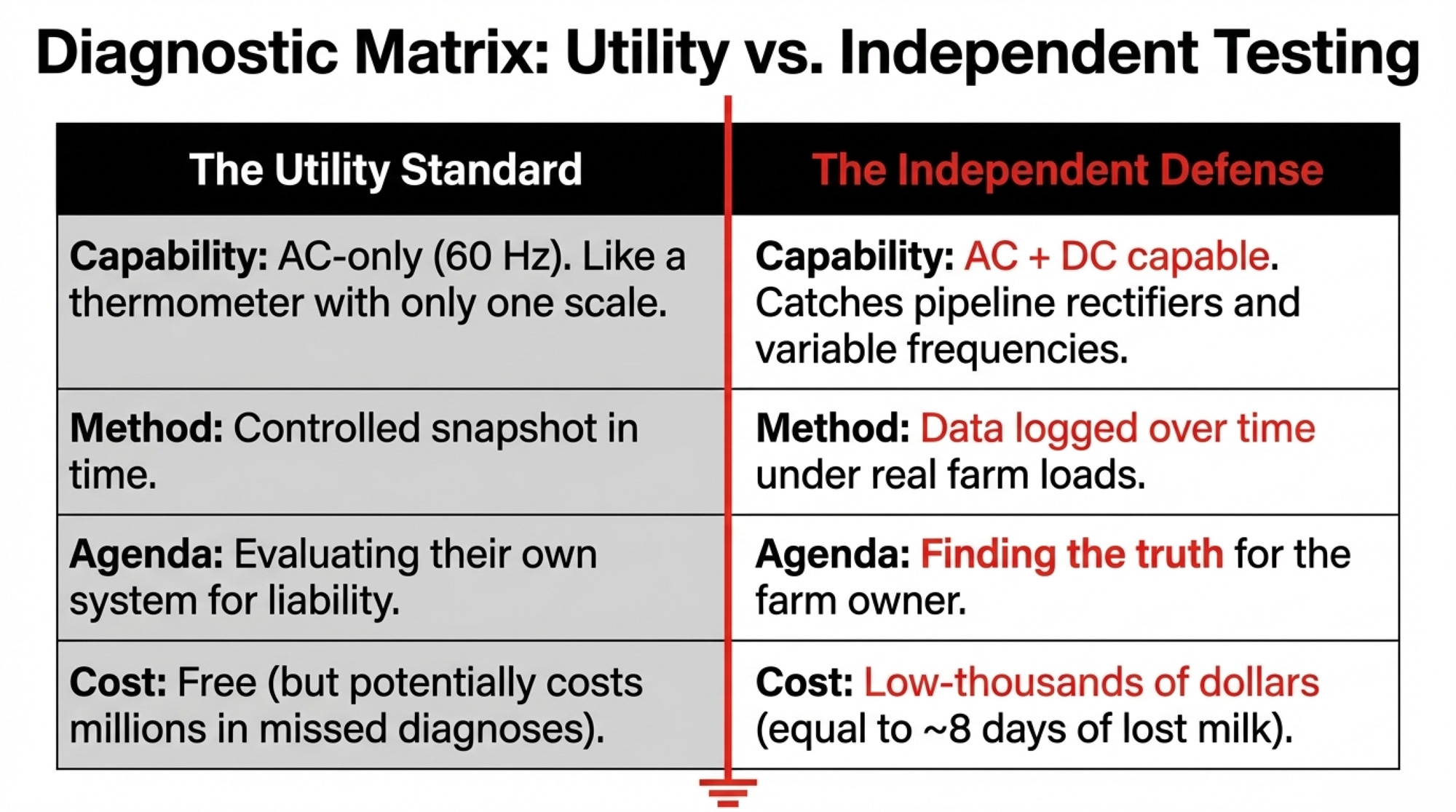 When your power company tests your farm, they’re evaluating their own system for potential legal exposure. They pick the test points, the timing, and the load conditions. They write the report. In states like Wisconsin, they follow PSC rules that set thresholds and protocols, which is better than nothing. But it’s still the entity whose system is being evaluated.