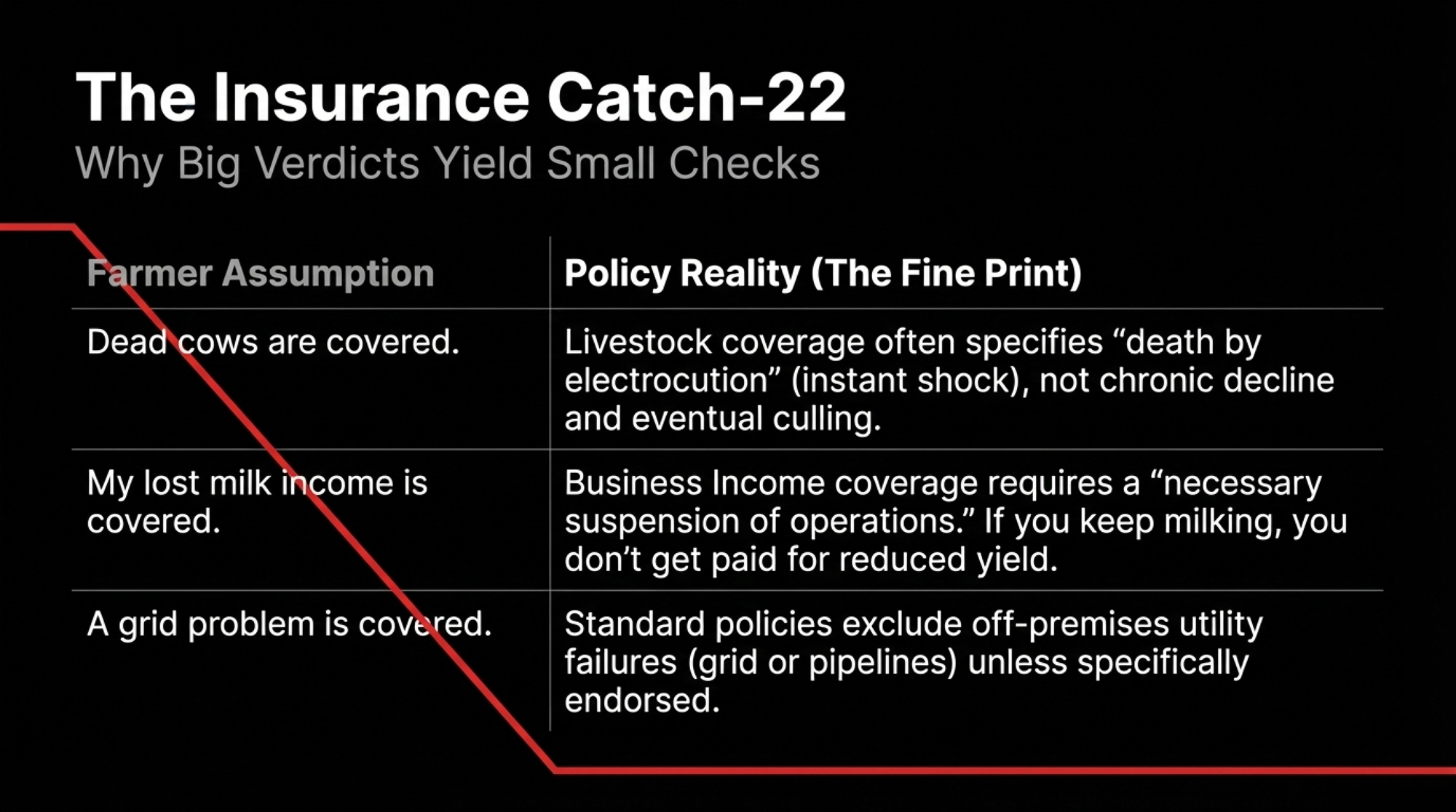 - If your business‑income coverage requires “necessary suspension of operations,” assume it won’t pay for years of reduced milk unless you literally shut down — and talk to your agent about endorsements that cover partial production loss.