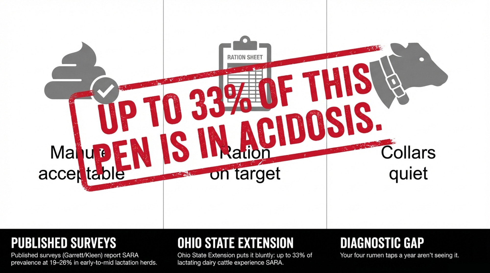 Now picture this: a set of rumen pH boluses in the fresh pen indicates that a quarter of those cows spent more than four hours below pH 5.8 yesterday. Nobody walking through the barn caught it. Published surveys report SARA prevalence at 19–26% in early-to-mid lactation U.S. Holstein herds (Garrett et al. 1997), with European data from Kleen et al. (2013) confirming similar rates across German dairies. Ohio State Extension puts it bluntly: up to 33% of dairy cattle experience SARA during lactation, and up to 40% of pasture cattle have a pH below 5.8. Ontario’s Ministry of Agriculture says if more than 30% of sampled cows sit at or below pH 5.5, consider the whole feeding group at risk. Your four rumenocentesis visits a year aren’t seeing this — and a lab in Zurich has proven it can read those fermentation signals from a field called exhalomics: the metabolic fingerprint in a cow’s exhaled breath.