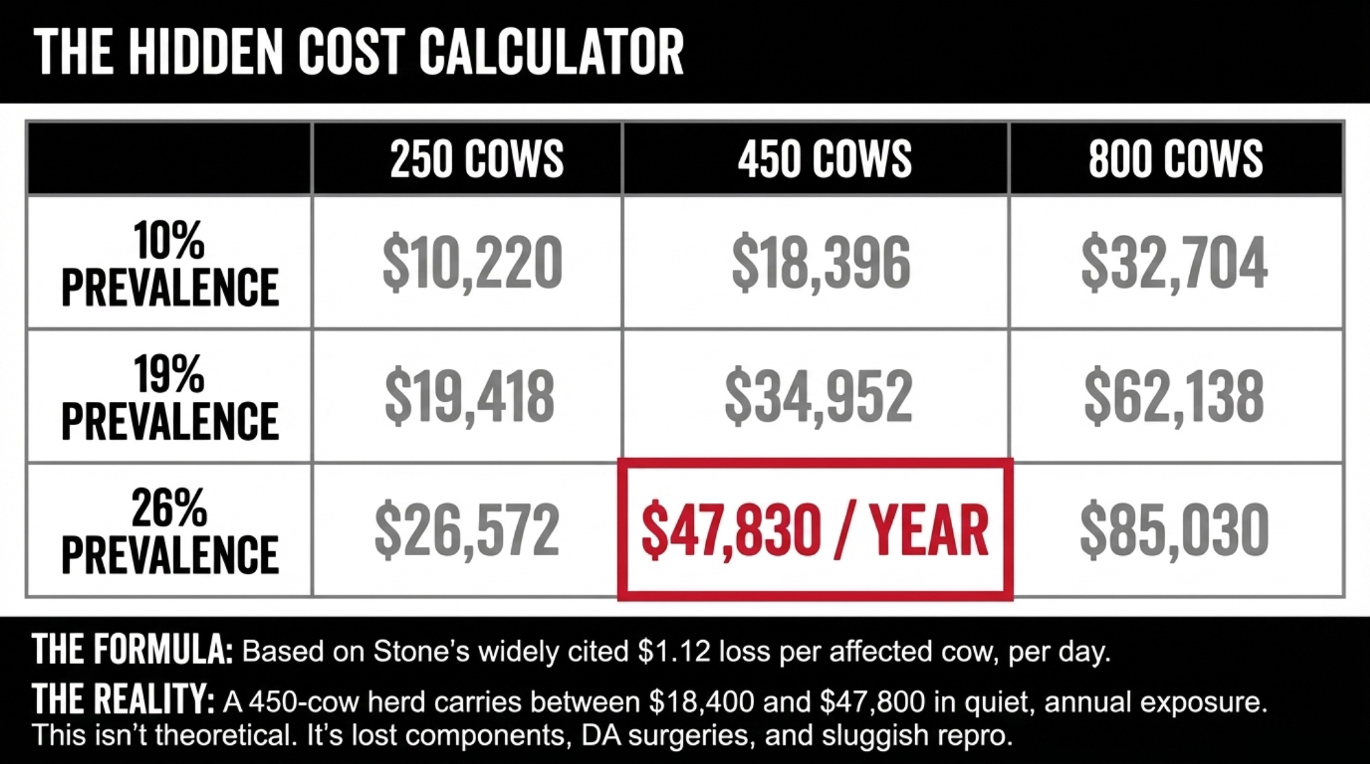 | Annual exposure | $18,400 – $47,800 | ~$3,500–$4,000 (40 cows) |