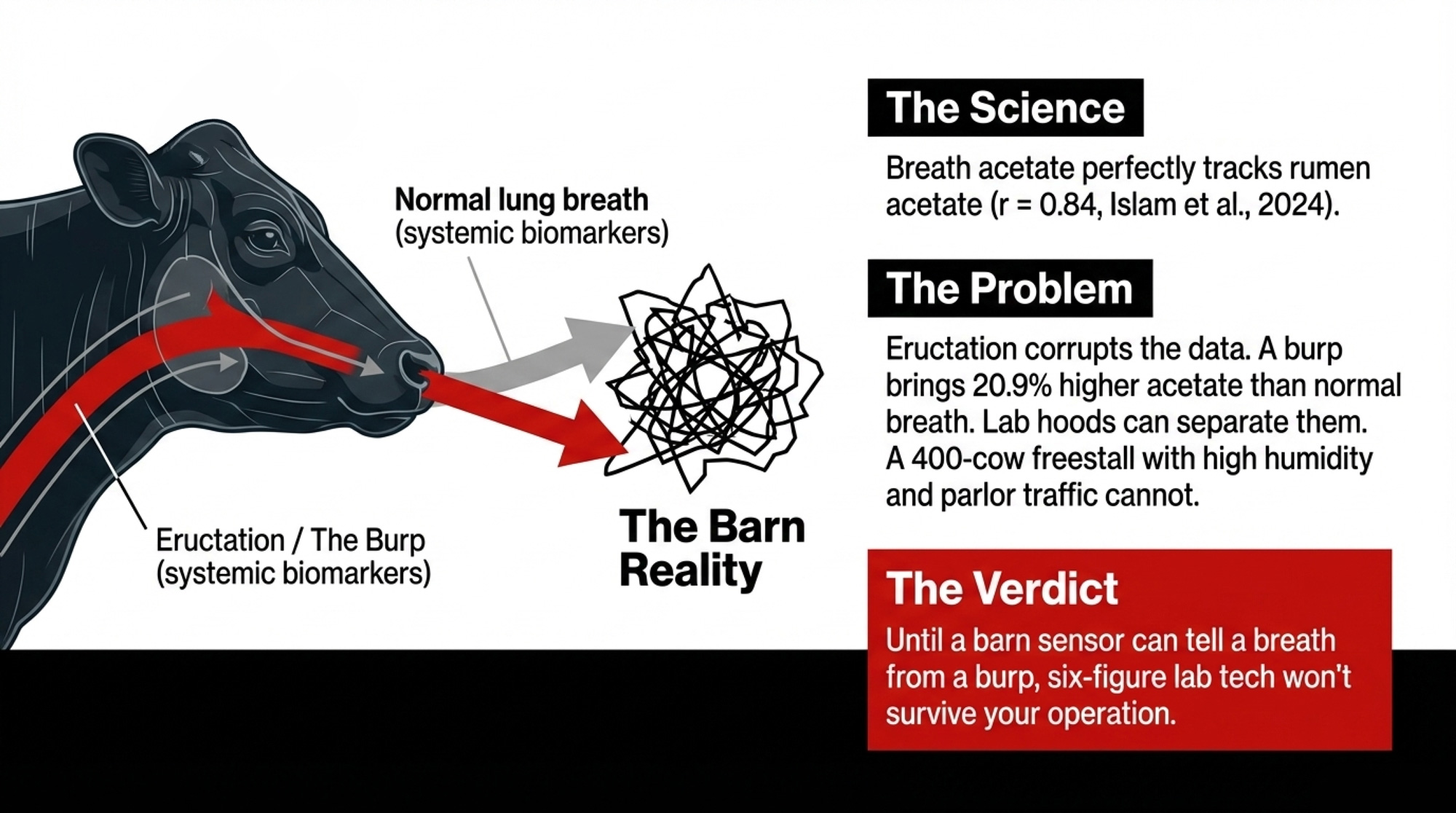 - The VFA correlations are real. The barn sensor isn’t. Islam et al. (2024, JDS) showed breath acetate tracking rumen acetate at r = 0.84. Serious science — but the eructation separation problem, six-figure instruments, and sample degradation mean no commercial barn sensor is imminent.