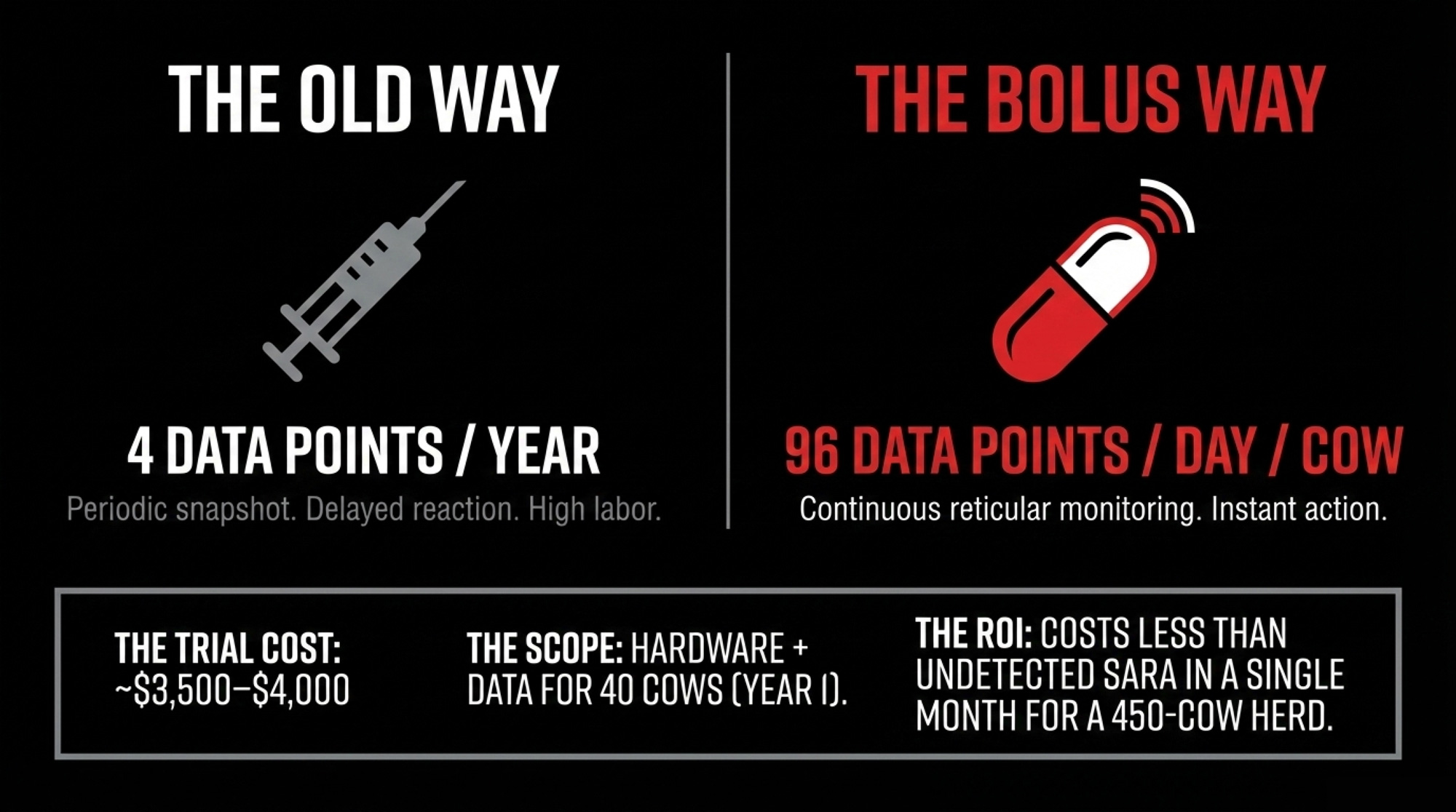But weighed against the quiet accumulation of undetected SARA — hoof problems, DAs, sluggish repro, chronically soft components — the question isn’t whether boluses are perfect. It’s whether four rumen taps a year are enough to catch a problem that never stops moving.