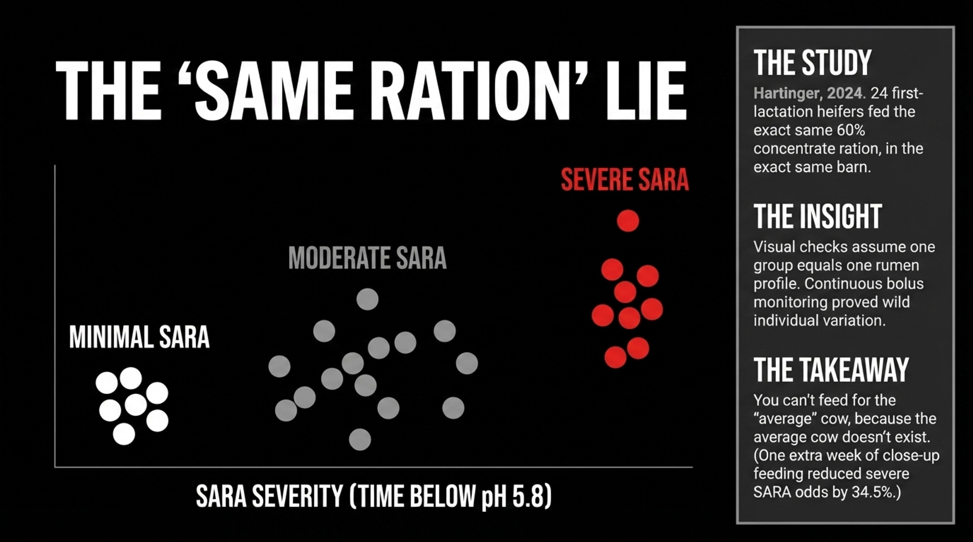 Here’s what makes this uncomfortable. Hartinger et al. (2024) bolused 24 first-lactation Holsteins at the VetFarm research station in Pottenstein, Austria — every heifer on the same 60% concentrate lactation ration. When they clustered the pH data, they didn’t find two groups. They found three. Six cows experienced minimal SARA, exceeding the pH 5.8 threshold for more than 330 minutes on just 7% of experimental days. Nine cows hit that threshold on 20–87% of days. Same feed. Same barn. Wildly different rumens. And one extra week of close-up feeding reduced the odds of severe SARA by 34.5%.