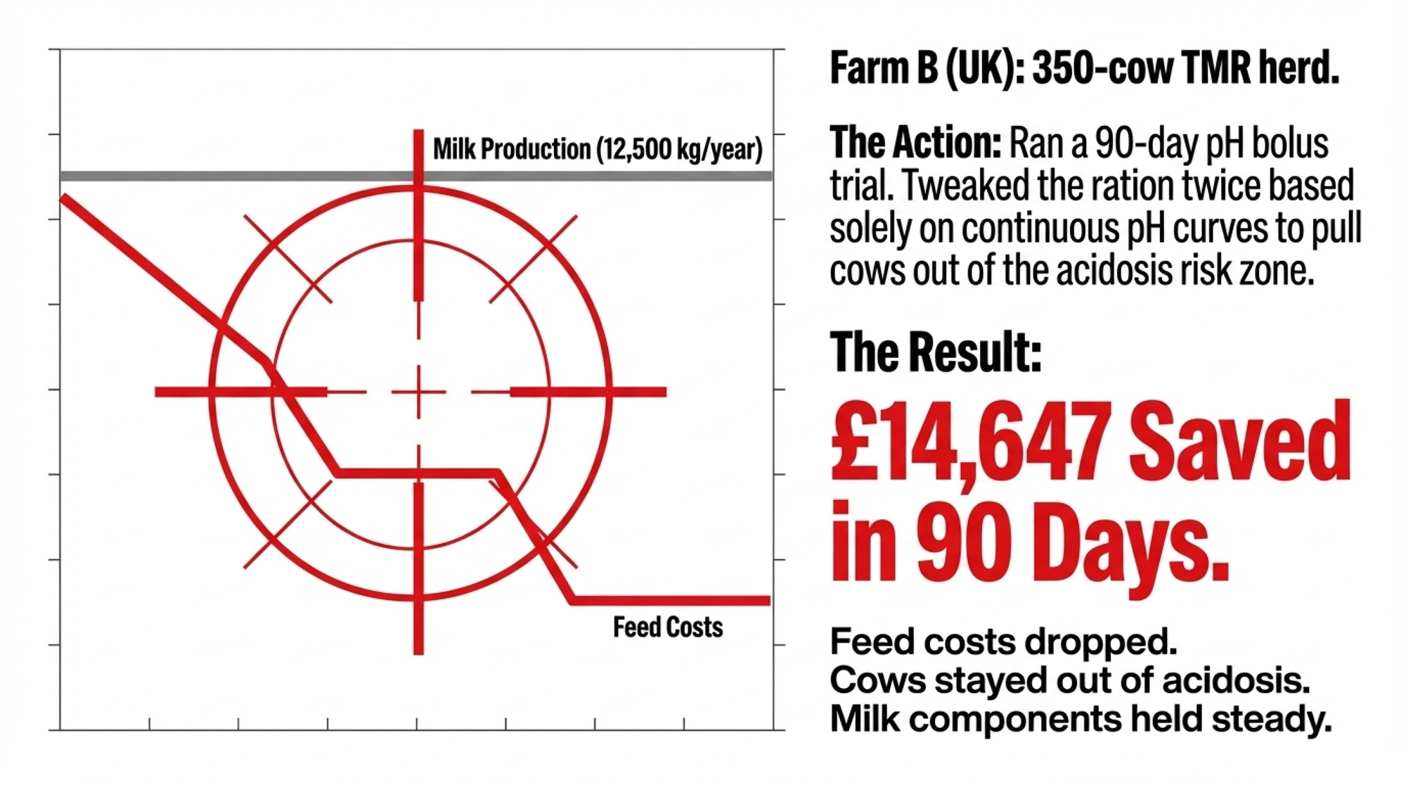 Those aren’t hypothetical numbers. When eCow ran a commercial pH bolus trial across eight dairy farms in South West England, six of the eight farms changed feeding management based on what the bolus data showed. Farm B — a 350-cow, 12,500 kg/year TMR herd — adjusted its ration twice in three months using pH curves as the guide. Each change cut feed cost while keeping cows out of the acidosis risk zone. Total savings: £14,647.50 in 90 days, with no decline in milk production or components. J. Hamilton of Three Counties Feeds, who advised on the trial, called the data “really useful to build up a picture of normal daily pH fluctuations on commercial farms” and noted it “highlighted the nutritional impact of management changes which force cows into unnatural daily routines”.