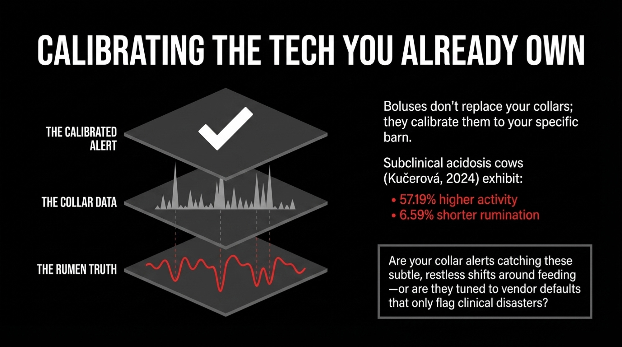 Benchmark your collars against rumen truth. Pull your lameness, DA, and chronic low-fat cows from the last six months. If subclinical acidosis cows show 57% higher activity and 7% shorter rumination in published data, are your alerts catching those patterns — or tuned for something else entirely?
