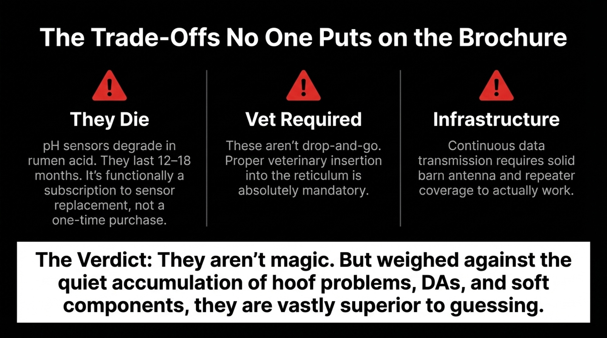 They also need vet insertion. Your barn needs adequate repeater or antenna coverage for continuous data transmission. And pH alone is only one dimension of a complex disorder — it doesn’t directly capture shifts in VFA profiles or microbial population changes. It’s a strong early signal. Not the whole picture.
