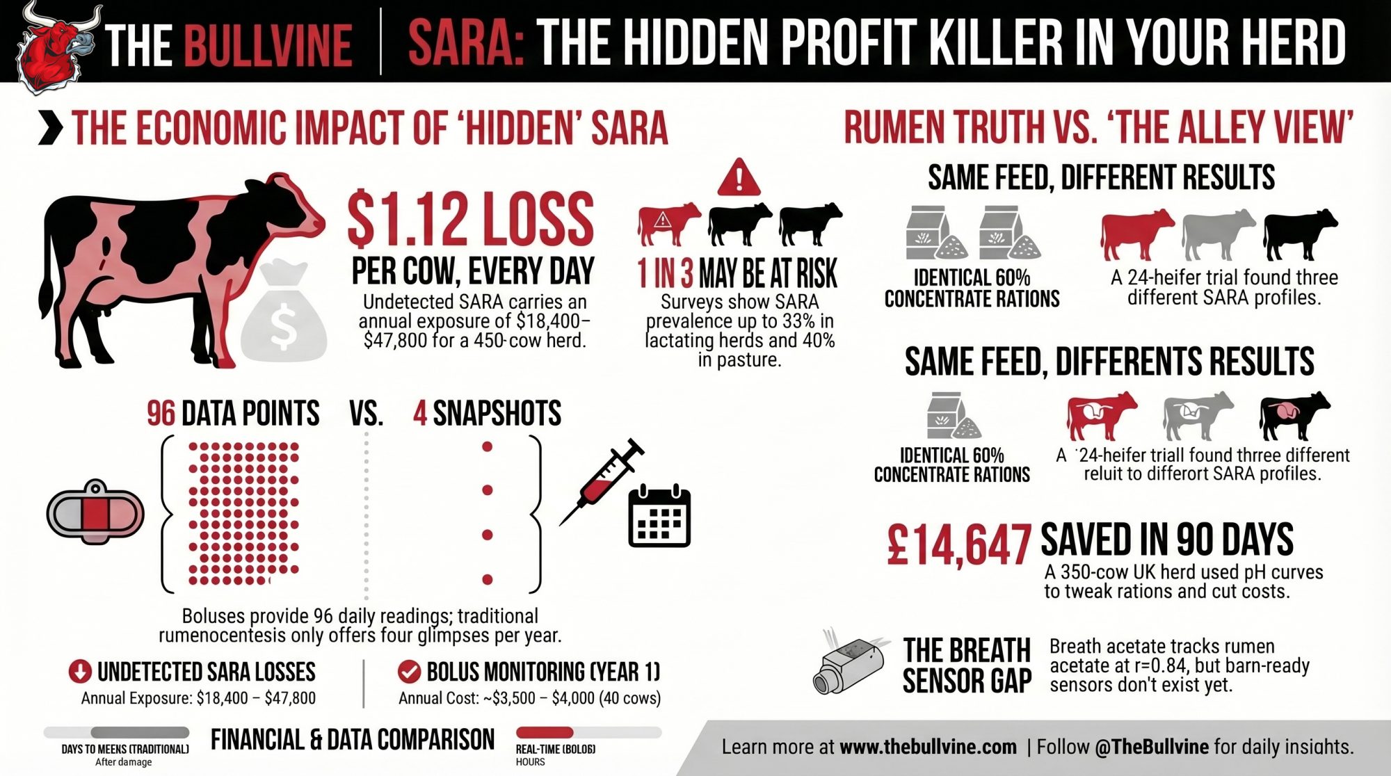 - Continuous pH turns SARA from a quarterly hunch into a daily decision. Four snapshots a year versus 96 data points per day. One UK herd saved £14,647 in 90 days from two bolus-guided ration adjustments alone.