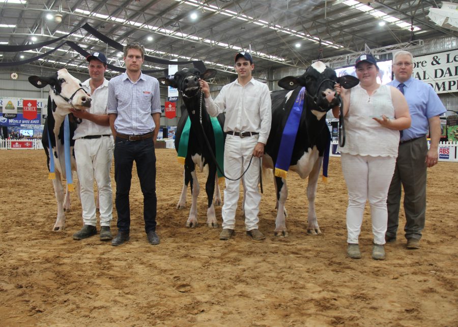 Senior Champion In-Milk Heifer (Senior Leader) was (r-l) Fairvale BC Armani (Cally O’Shannassy, Vic) followed by Reserve Elmar Firstclass Jessica (Brady Hore, Vic) and Honourable Mention Lightning Ridge Archrival Jane 2 (Dylan McDonald, Vic) Photo Crazy Cow In Print
