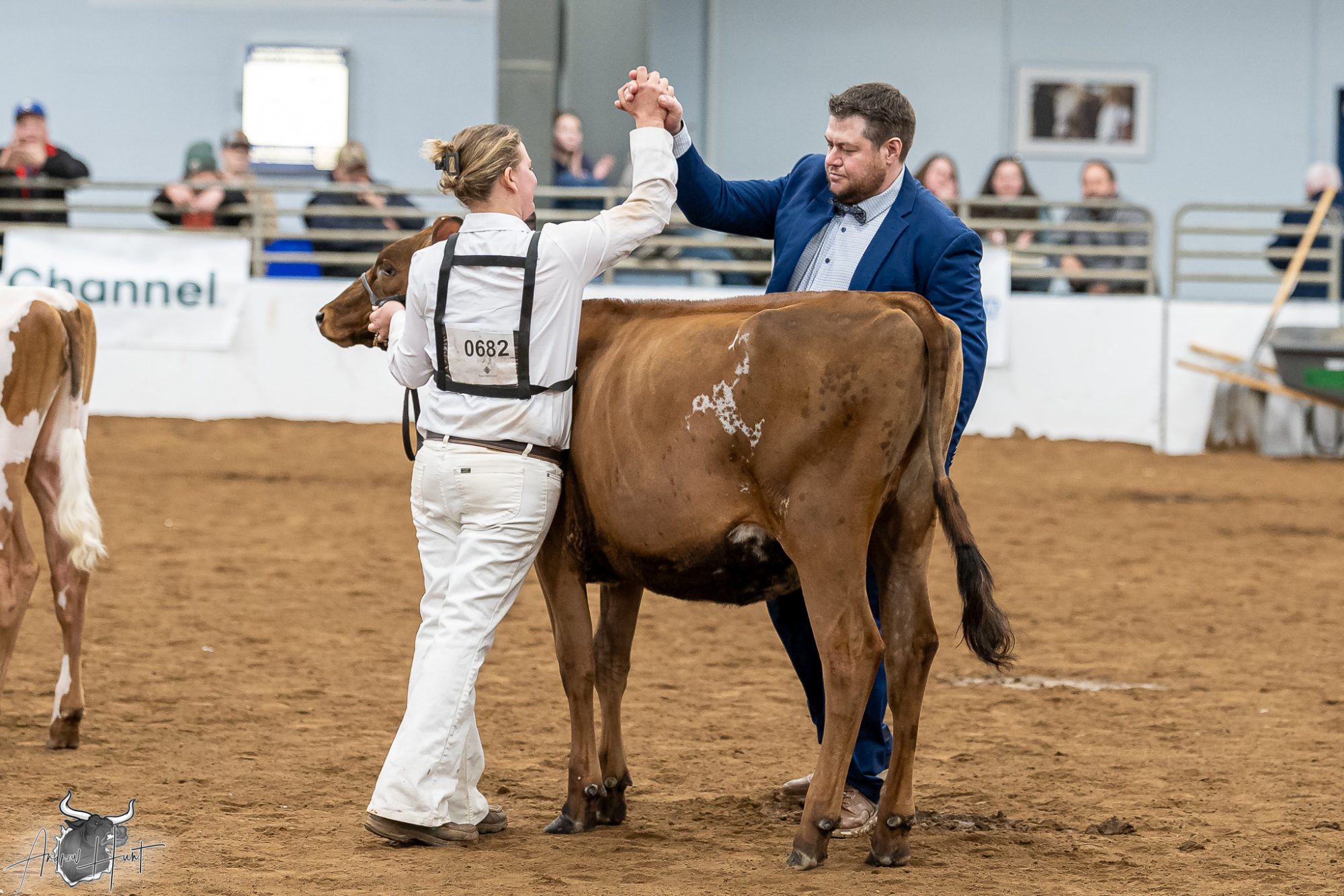 JP Charest sorted through roughly 49 head across 13 classes on Sunday afternoon, running simultaneously with the Brown Swiss show in the Cause Building. The cow show side was thin — single entries in three milking classes and no entries at all in both the Winter Heifer Calf and Senior 2-Year-Old classes. But what showed up in the heifer classes brought genuine depth and quality.