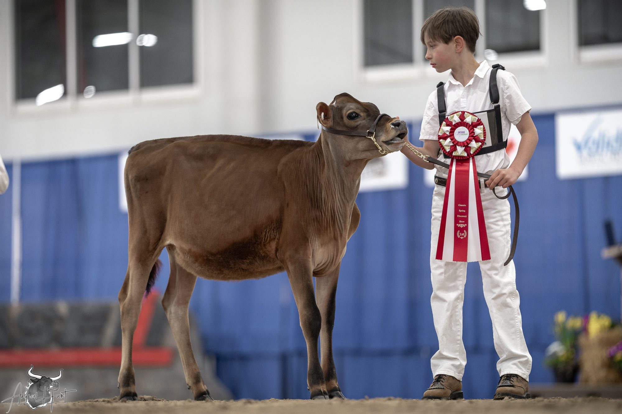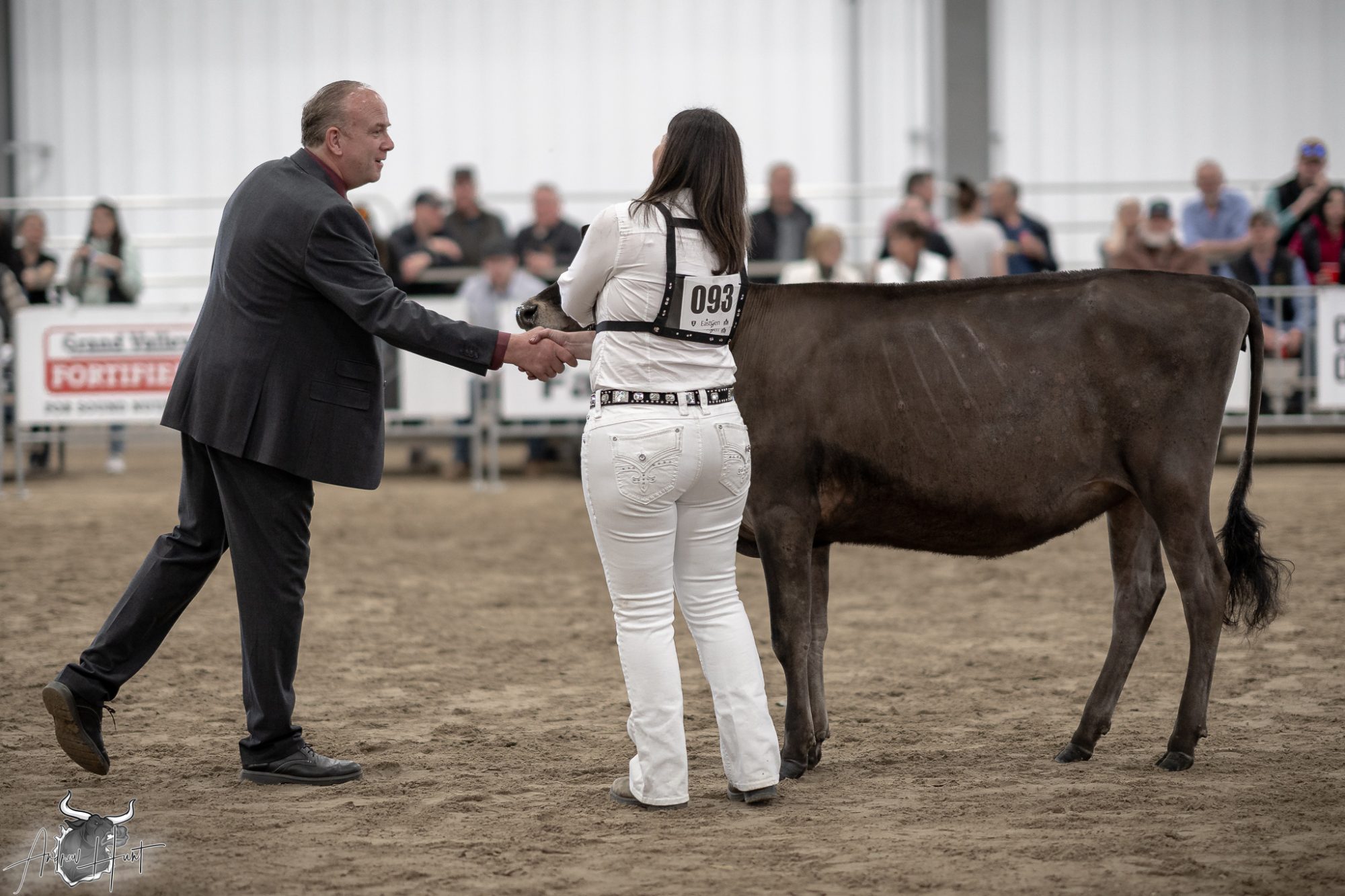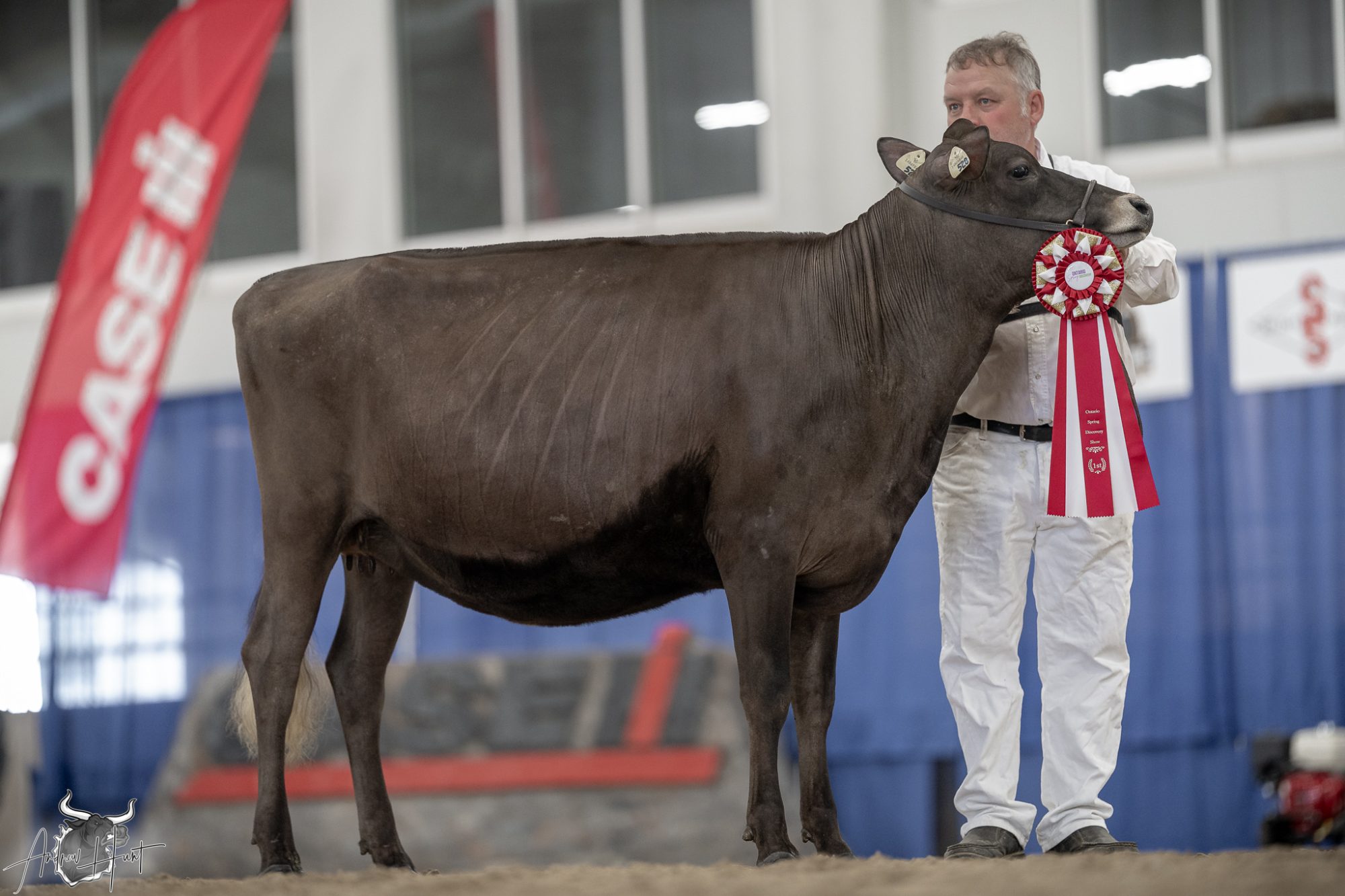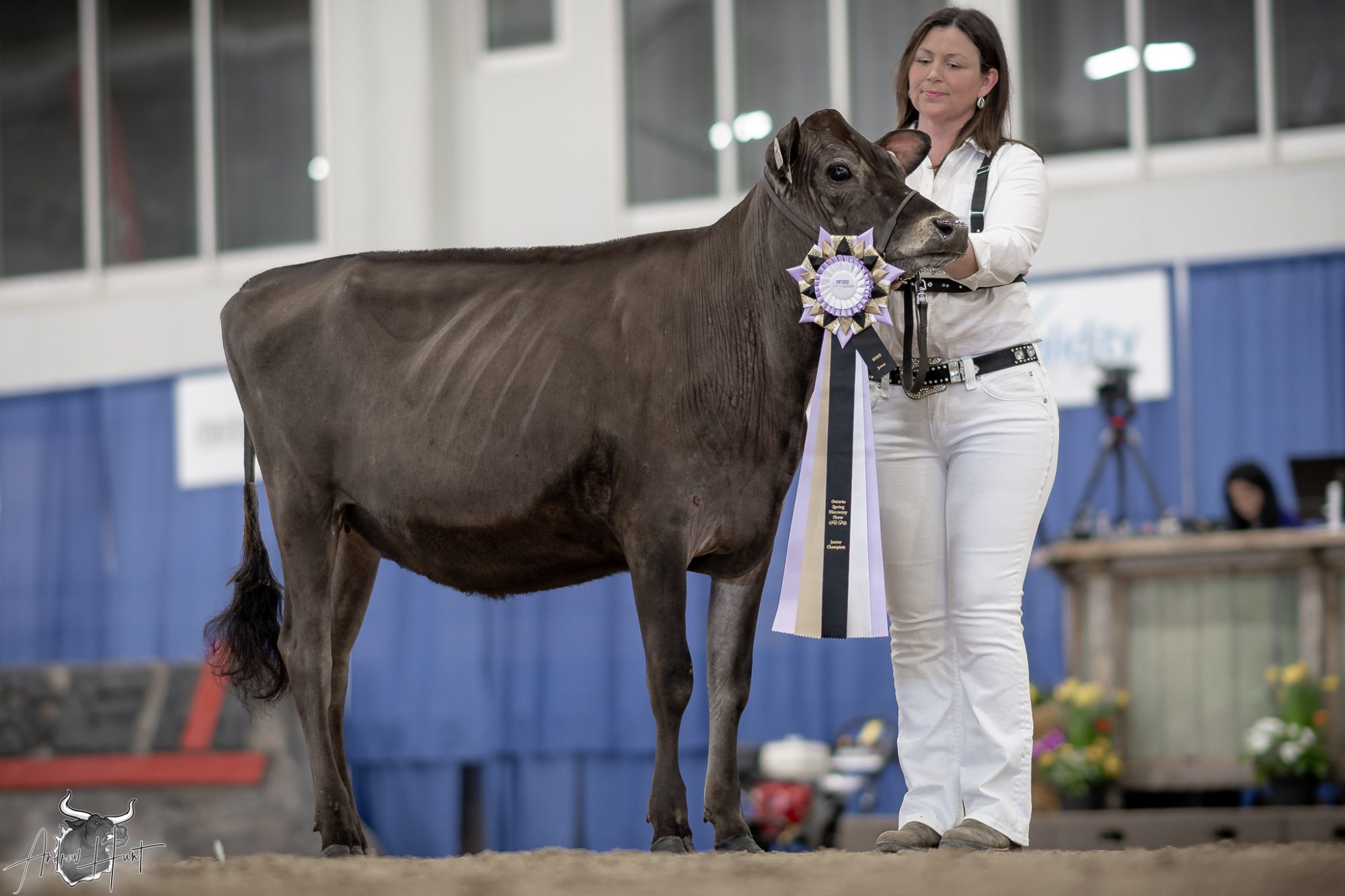 The junior end of the show ran through some serious heifers. Golden Joyride Emmy (Golden Jerseys, Mildmay) anchored her summer yearling class and walked out with Reserve Junior Champion, rewarded for chest width, a long angular cut, and a springy rib. Sparks Kaymanor ACC Daytona (AJ Genetics & Braemont) took Honourable Mention Junior Champion out of the fall yearlings on the strength of length, balance, and an outstanding set of feet and legs.