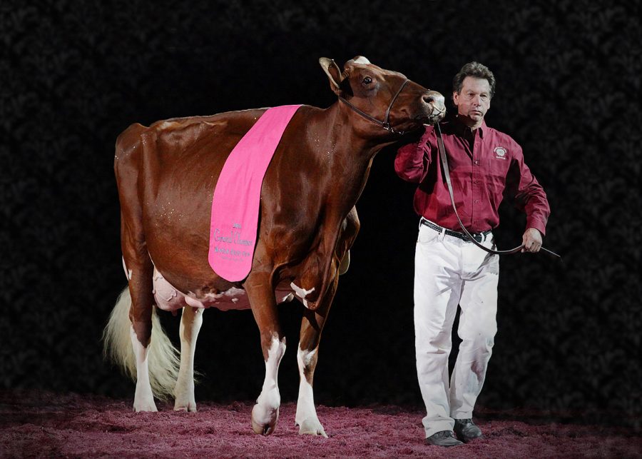 KHW Regiment Apple-Red-ET EX96 4E DOM 19* being led by one of the men who made her, Mike Deaver. Apple was only shown eight times in her career – for three historical results at WDE and seven All-American nominations. Today, she has more than 280 EX descendants all over the world and is the only cow to have her clone beat her for Grand at WDE and her daughter finish Honourable Mention. Her sons and grandsons have also had an extraordinary impact on both the Black & White and Red & White populations. And, there isn’t a person on the planet interested in great cows who doesn’t know her, thanks to these iconic images which serve as part of her legacy and help so many market her progeny. Photo: Nina Linton.