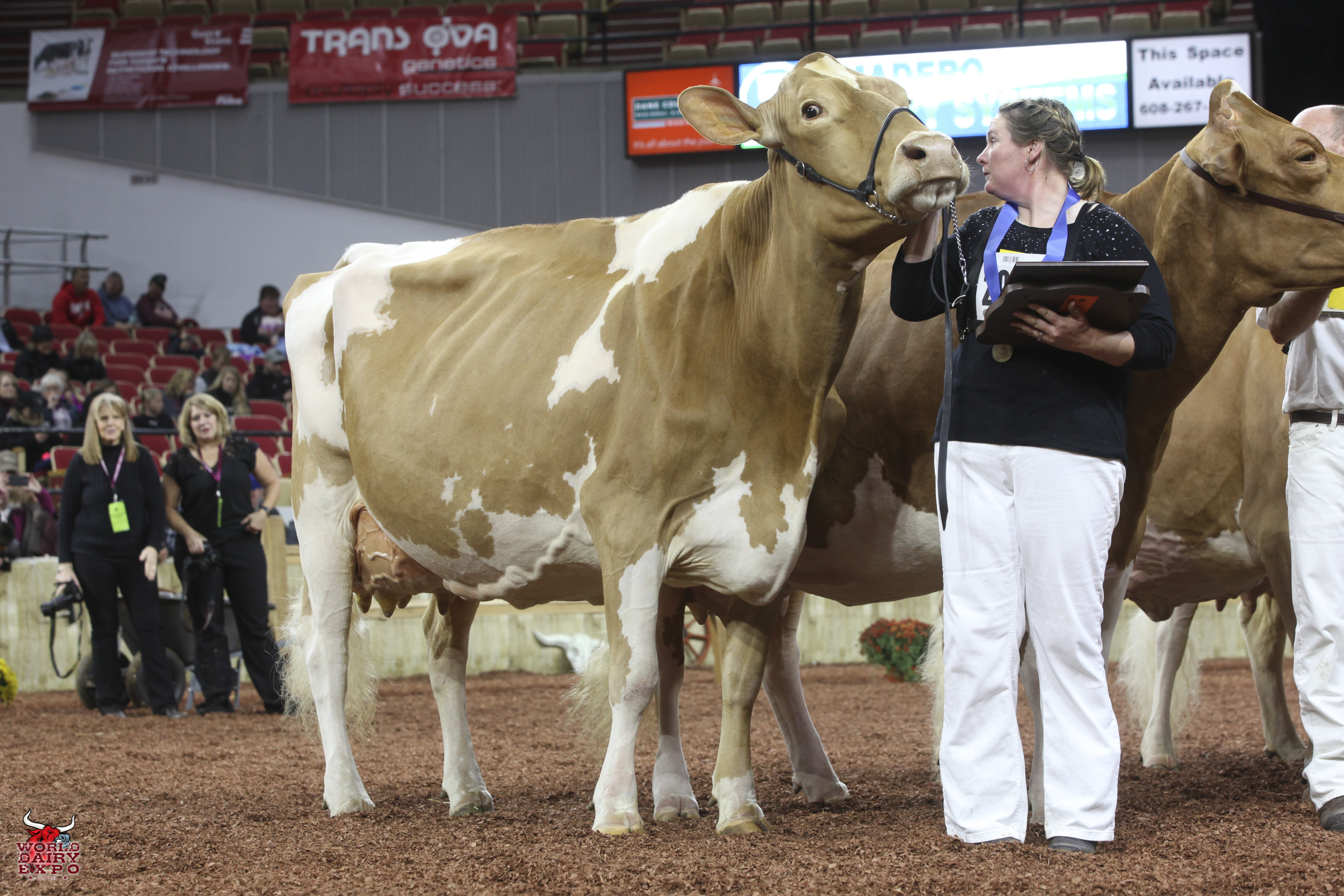Rounding out the list of champion cows in the International Guernsey Show are Intermediate Champion Female, Hi Guern View Diva Designer, exhibited by Riley Zettle of Rock City, Ill., and Reserve Intermediate Champion, Warwick Manor Ty Carter, exhibited by Kaila, Karli and Kolby Stoltzfus, East Earl, Pa. As Intermediate Champion, Designer wins a free ovum pick-up, compliments of Vytelle LLC