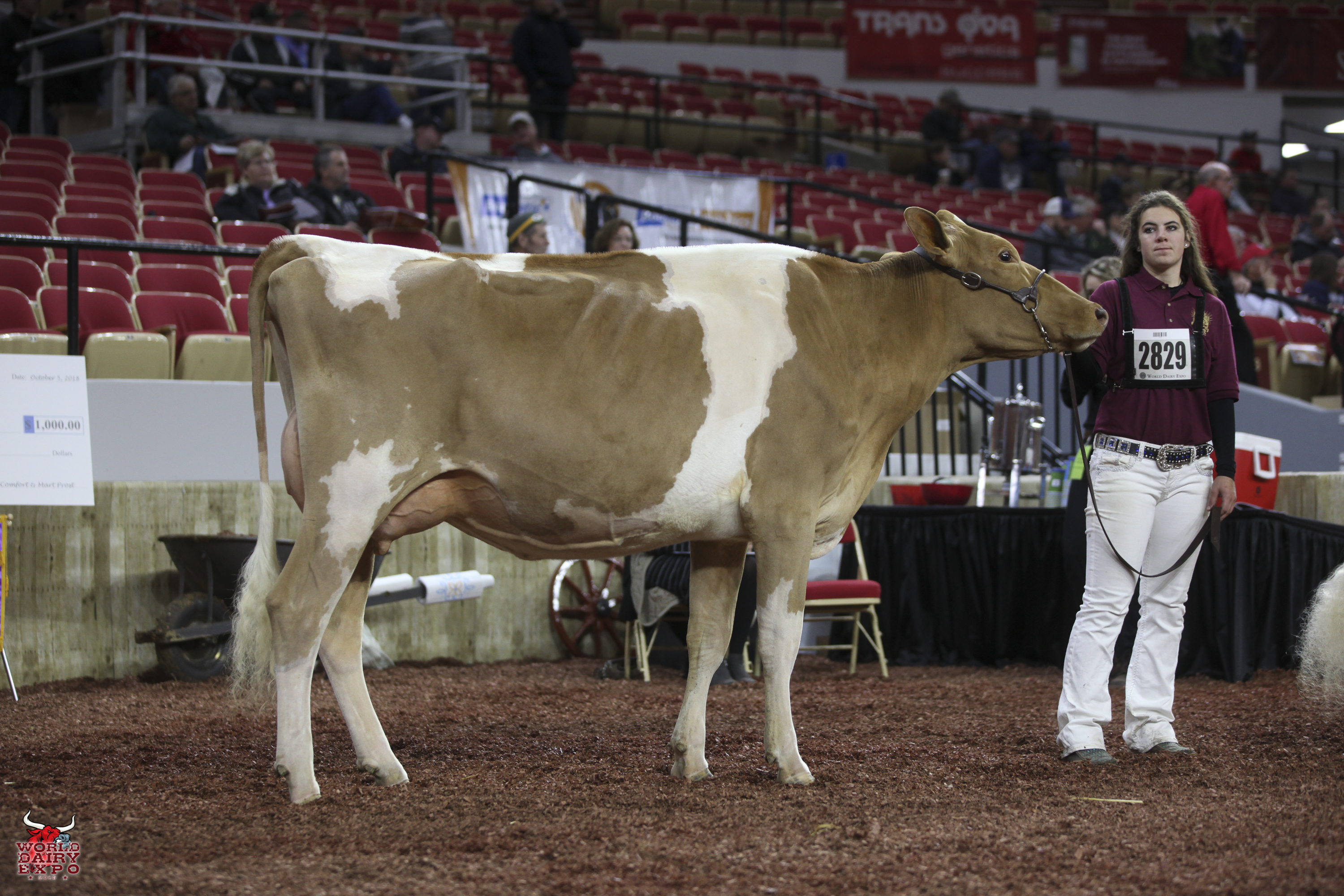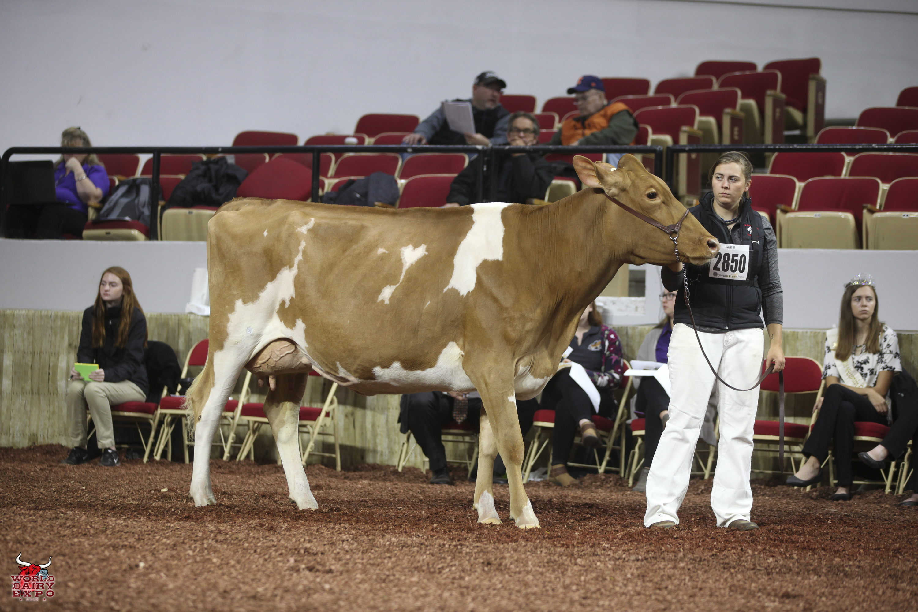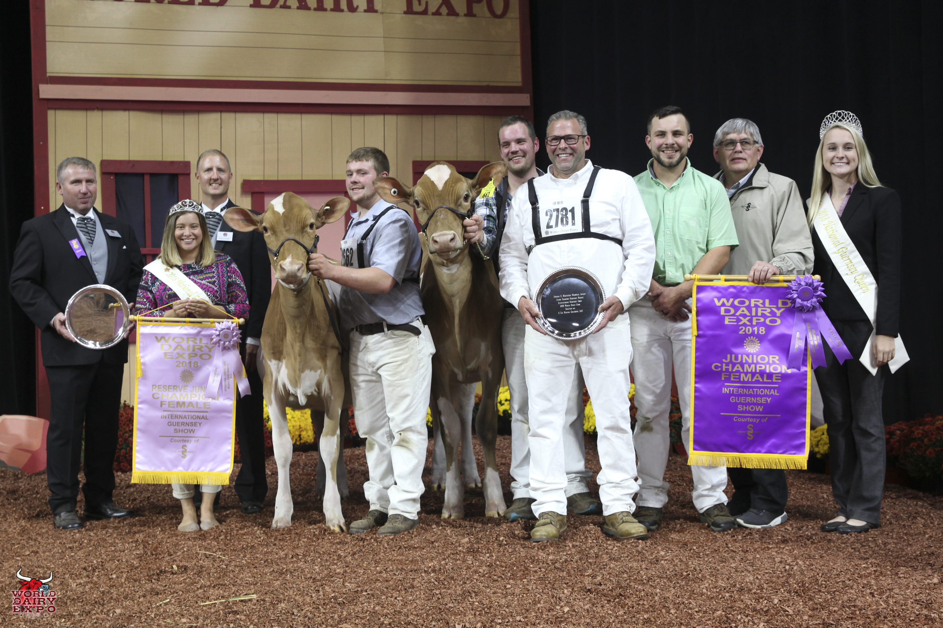 Rounding out the list of champion cows in the International Guernsey Show are Intermediate Champion Female, Hi Guern View Diva Designer, exhibited by Riley Zettle of Rock City, Ill., and Reserve Intermediate Champion, Warwick Manor Ty Carter, exhibited by Kaila, Karli and Kolby Stoltzfus, East Earl, Pa. As Intermediate Champion, Designer wins a free ovum pick-up, compliments of Vytelle LLC