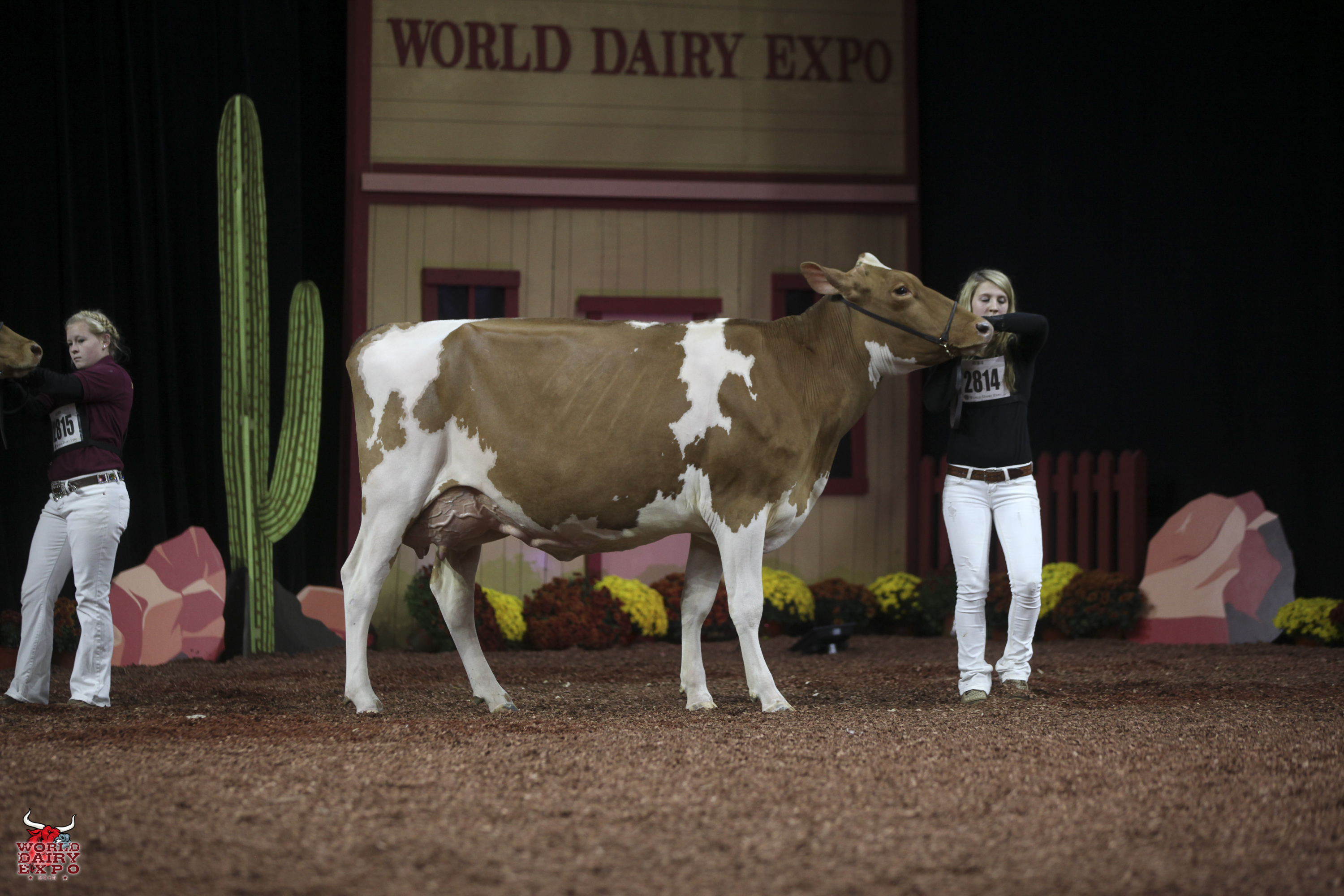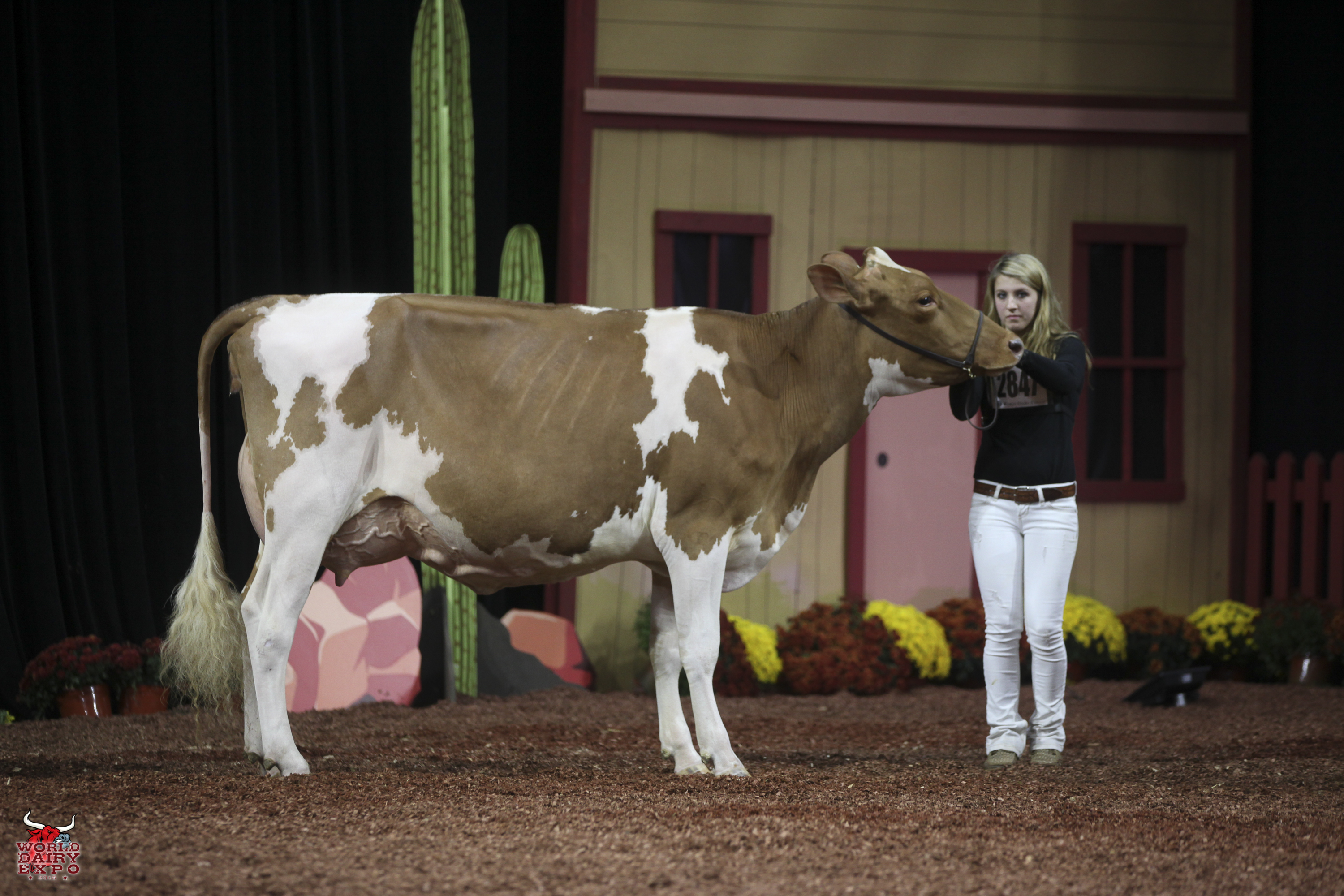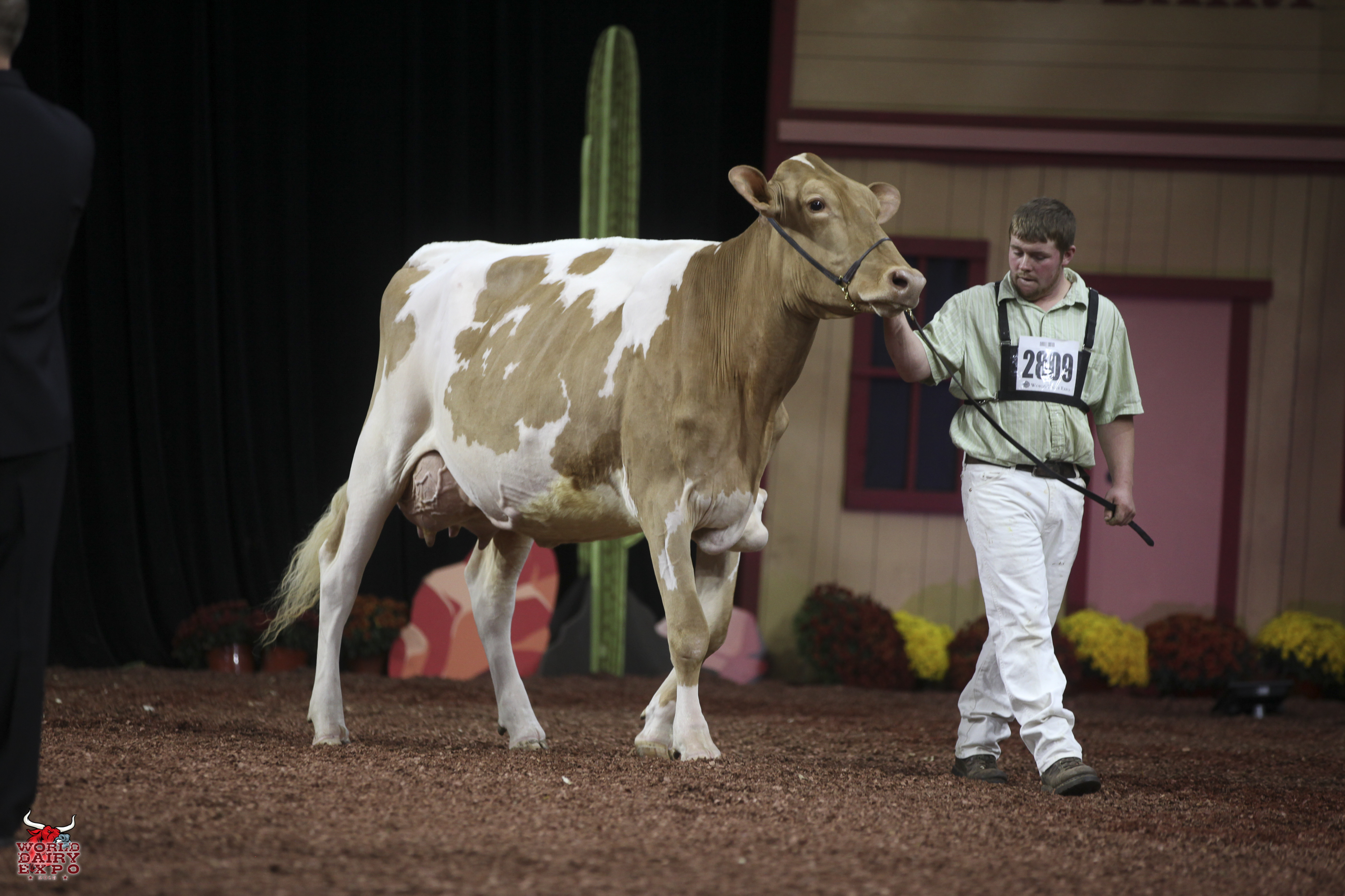 Willow Brook Labron Toni took home two Champion titles at the International Guernsey Show. Owned by Jake Booher, West Middlesex, Pa., Toni’s first trip across the colored shavings on October 5 was when she rose to the top of the Five-Year-Old Cow Class on her way to being named Senior and Grand Champion Female. Toni was presented with the $1,000 Udder Comfort Grand Champion Cash Award and the Allen Hetts Grand Champion Trophy. First in the Six-Year-Old Cow Class, Reserve Senior and Reserve Grand Champion of the International Guernsey Show was Hi Guern View Dancing Diva-ET, exhibited by Brian and Kristi Dinderman, Orangeville, Ill..