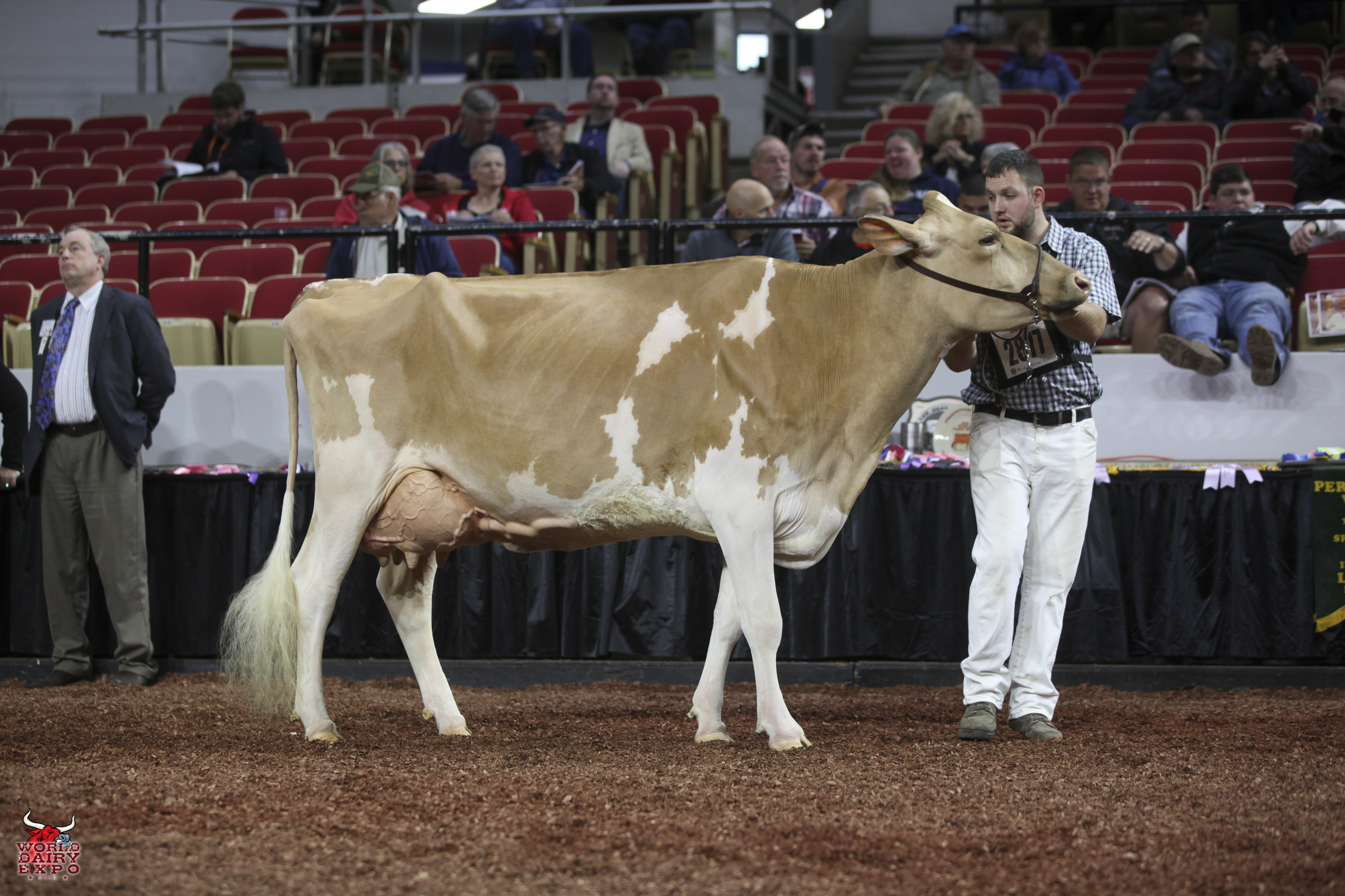 The winning Five-Year-Old Cow of the International Junior Jersey Show, SV Impression Holly-ET, was named Senior Champion and then Grand Champion of the show. Holly, exhibited by River Valley Farm – Ben, Andy, Blessing and Grace Sauder of Tremont, Ill., received the $500 Udder Comfort Grand Cash Champion Award. Reserve Grand Champion honors went to the Reserve Senior Champion, Meadow Ridge Jackknife Summer, the first place Six-Year-Old & Older Cow, owned by Michael Riebe and Alleah and Emma Anderson of Cumberland, Wis. These cows received a Lillian & Keith King and Jim King Grand Champion and Reserve Grand Champion of the Junior Show award, respectively.