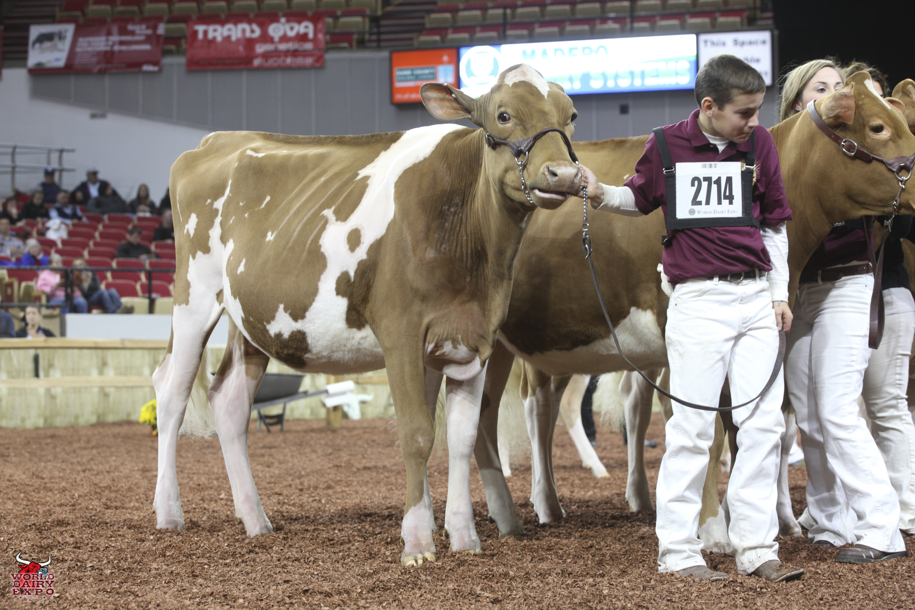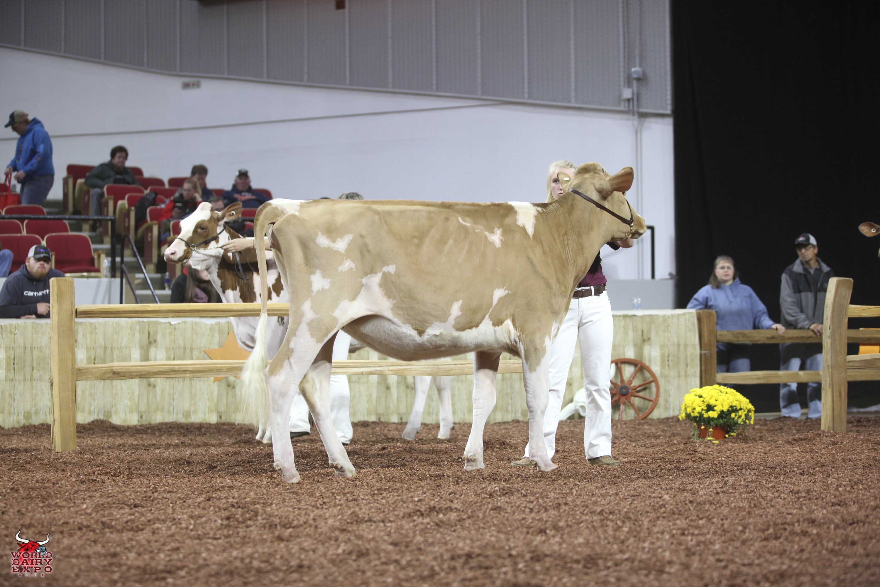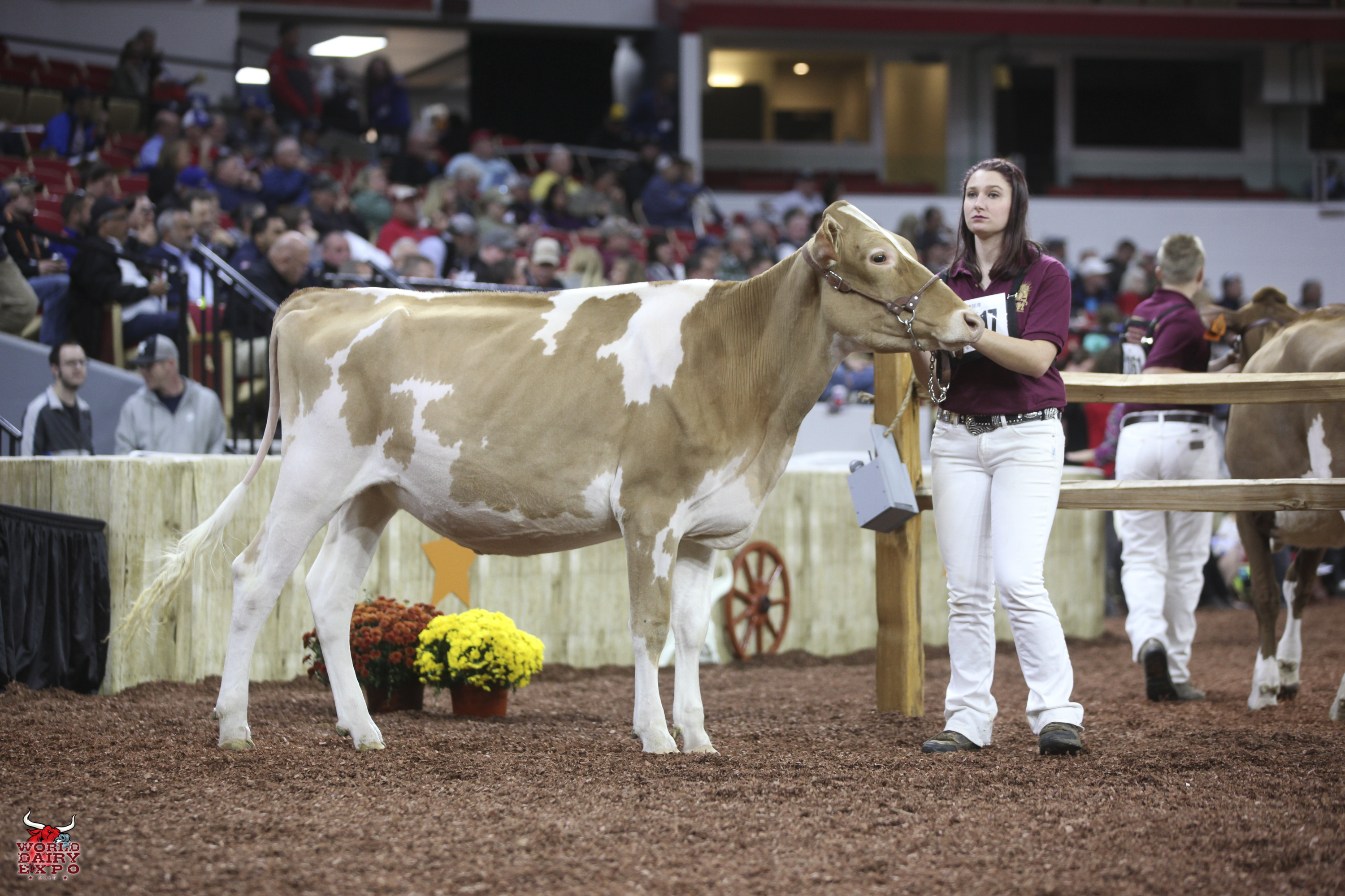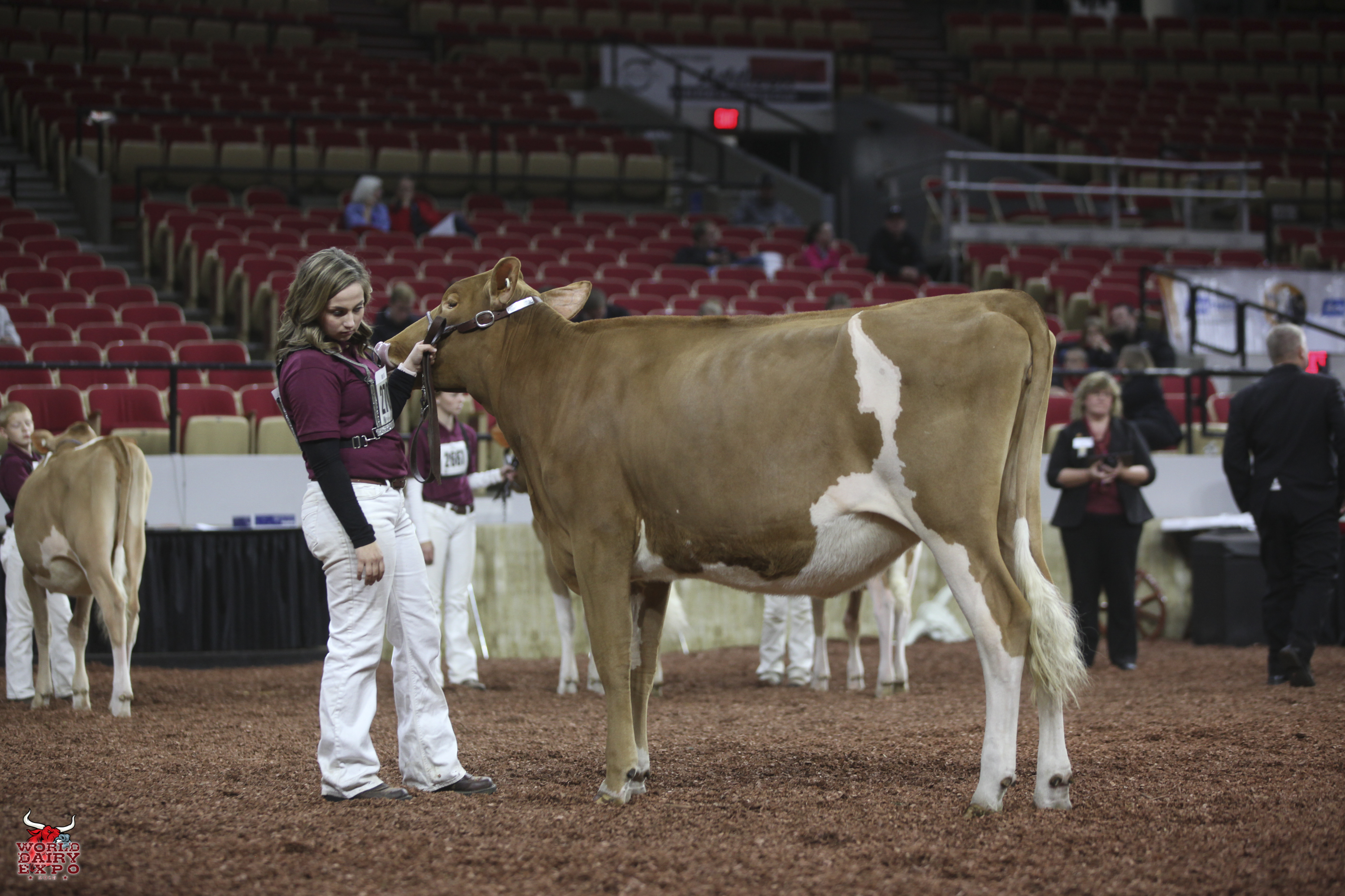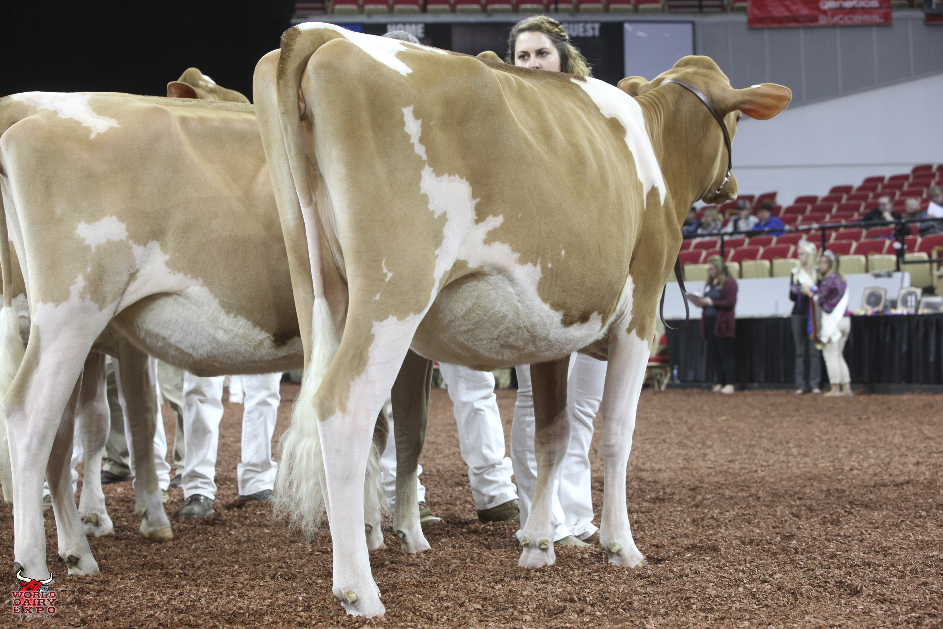 Rounding out the list of champion cows in the International Guernsey Show are Intermediate Champion Female, Hi Guern View Diva Designer, exhibited by Riley Zettle of Rock City, Ill., and Reserve Intermediate Champion, Warwick Manor Ty Carter, exhibited by Kaila, Karli and Kolby Stoltzfus, East Earl, Pa. As Intermediate Champion, Designer wins a free ovum pick-up, compliments of Vytelle LLC