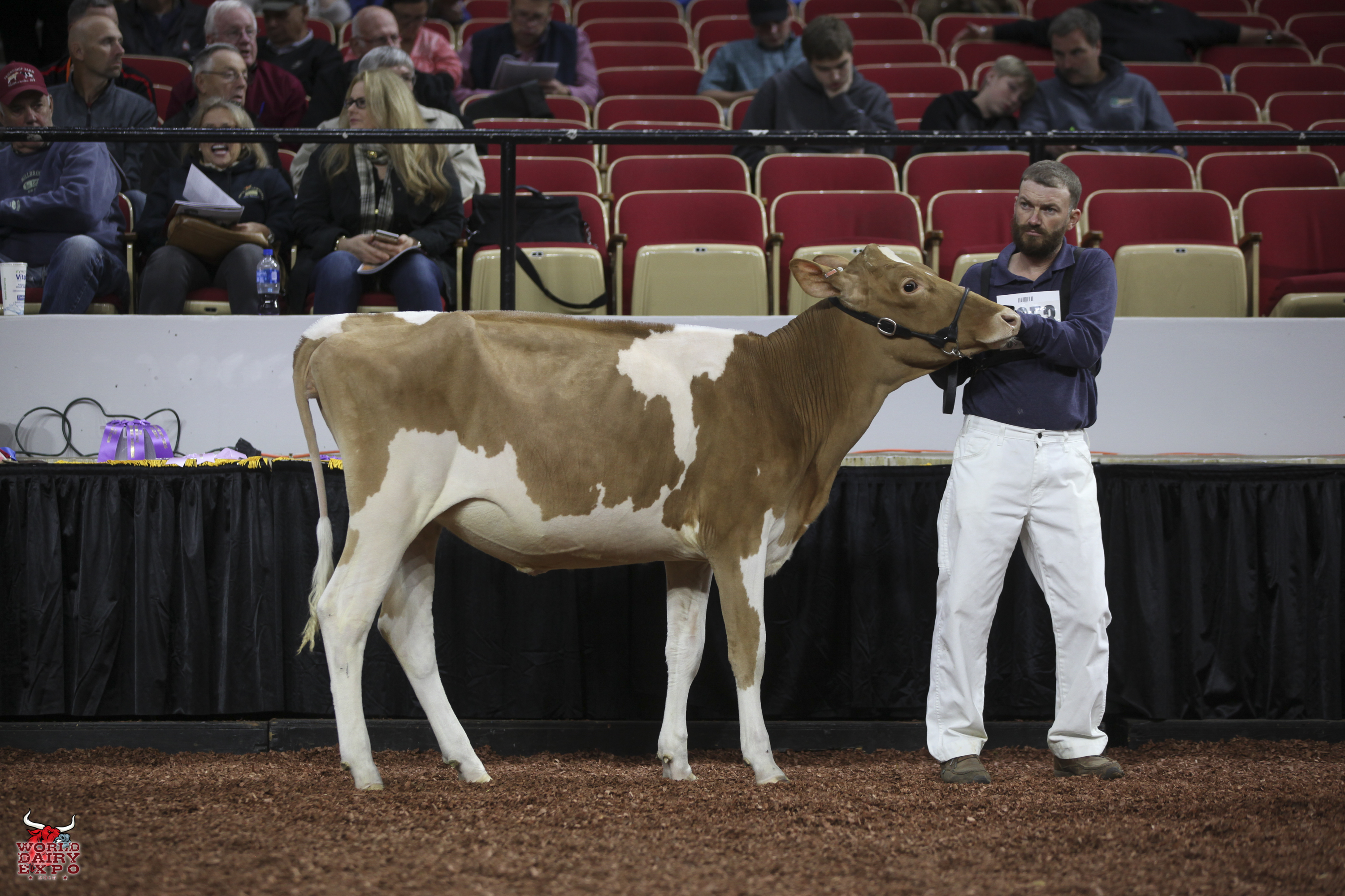Willow Brook Labron Toni took home two Champion titles at the International Guernsey Show. Owned by Jake Booher, West Middlesex, Pa., Toni’s first trip across the colored shavings on October 5 was when she rose to the top of the Five-Year-Old Cow Class on her way to being named Senior and Grand Champion Female. Toni was presented with the $1,000 Udder Comfort Grand Champion Cash Award and the Allen Hetts Grand Champion Trophy. First in the Six-Year-Old Cow Class, Reserve Senior and Reserve Grand Champion of the International Guernsey Show was Hi Guern View Dancing Diva-ET, exhibited by Brian and Kristi Dinderman, Orangeville, Ill..