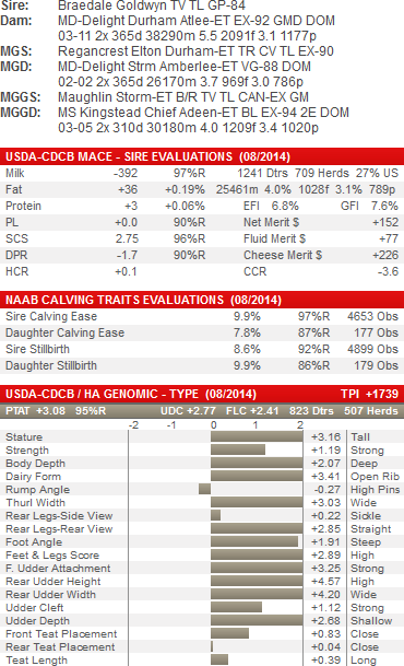 While there has been little doubt that Atwood has become the most successful Goldwyn son, the 2014 World Dairy Expo certainly helped his case for becoming the Goldwyn heir apparent. One need only look at the Junior 3 year old class, where the top 3 animals, Jacobs Atwood Vedette, BVK Atwood Abbie-ET and Windy-Knoll-View Parfait-ET were all sired by Atwood. Also impressive was the 2nd place Senior 2 Year Old Lotto Atwood Lizette. It seems to be just a matter of time before Atwood will take over the crown from this once-in –a-generation sire. Atwood and his extensive use and consistent transmitting ability will certainly leave the most daughters that will contend with those of his sire Goldwyn. There are so many reasons to choose Atwood. First you have the magic Goldwyn on Durham cross. Then you add in his dam who was the exceptional MD-DELIGHT DURHAM ATLEE EX-92-4YR-USA DOM GMD 2*. Atlee also had extreme conformation herself, winning Reserve Intermediate Champion at Madison in 2005, and going on to be named unanimous ALL-AMERICAN SR.3-YR that year. She comes by it naturally with her grand dam being MS Kingstead Chief Adeen EX-94. Combine that with the greatest type sire of the past half-decade, Goldwyn, and you have yourself an unbeatable show-winning package. Atwood offers the great mammary systems his pedigree would indicate but needs to be protected for flat loins and high pins, much like his sire. While he may not pass his sire in accomplishments, there is no question that Atwood is establishing himself as the heir apparent.