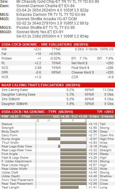 While at only +3.08 on type and weak median suspensory scores, you may ask “How does attic make the list?” Sure he is the Goldwyn son of the great type brood cow MD-Delight Durham Atlee-ET EX-92 GMD DOM but the real reason is ….CHARWILL ATTIC MARCY. Since winning H.M. All-Canadian Milking Yearling in 2012, this great young cow has just gotten better. She was 1st Senior 2-yr-old, Best Udder at the 2013 World Dairy Expo and Royal Winter Fair and this year, milking over a year, she was named 1st Sr 3 year old and Intermediate Champion at Expo. Sure Attic may only have one shot, Marcy, at siring the next Grand Champion, but she has to be the one of the two non-Goldwyn sired animals in North America most likely to do it. Attic offers great feet and leg improvement with outstanding bone quality, and will need to be protected on his median suspensory ligament as well as his rear teat placement.