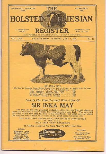 Carnation’s own ad for Sir Inka May on the July 1, 1930 cover of The Holstein‑Friesian Register—proof that the “Crown Prince” from Minnesota had become the headline sire in a program built on turning big records into even bigger semen sales.