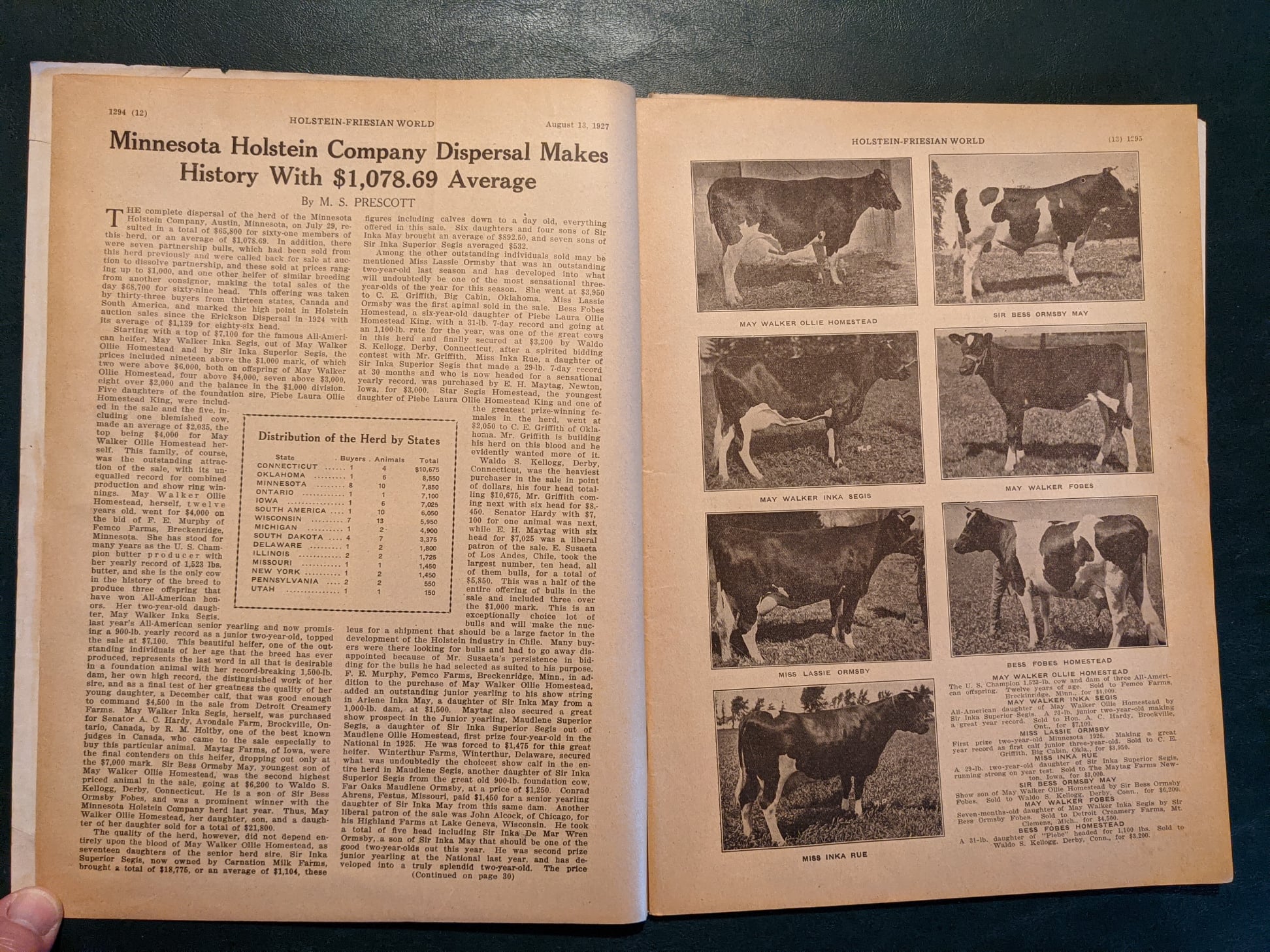 Minnesota Holstein Company Dispersal Makes History with $1,078.69 Average” — the 1927 Holstein‑Friesian World spread that proved Culver and Eberhard’s 75‑cow “boutique” herd was no hobby, with buyers from across North America paying triple the going rate for cows like May Walker Ollie Homestead and the families behind Sir Inka May.