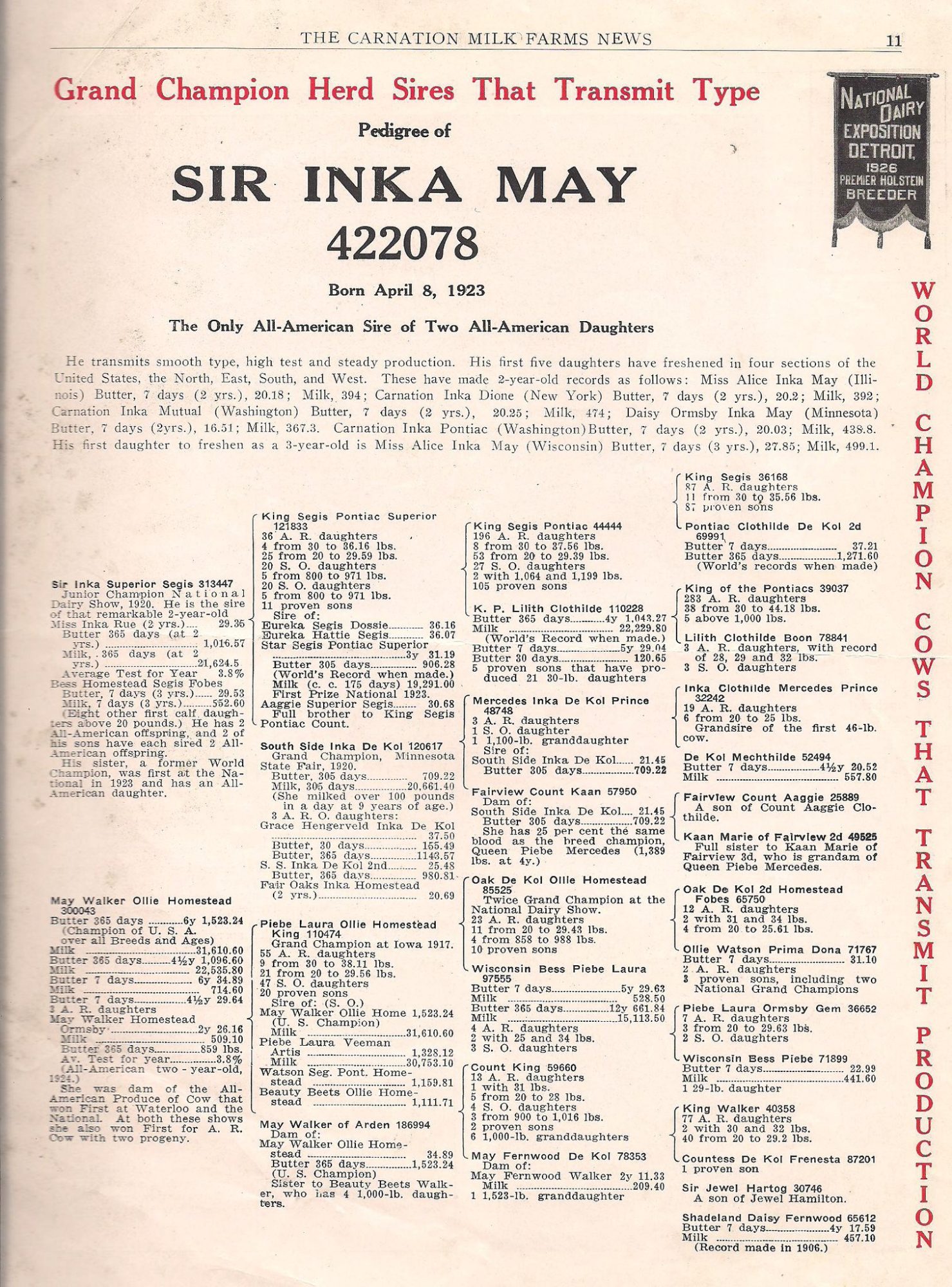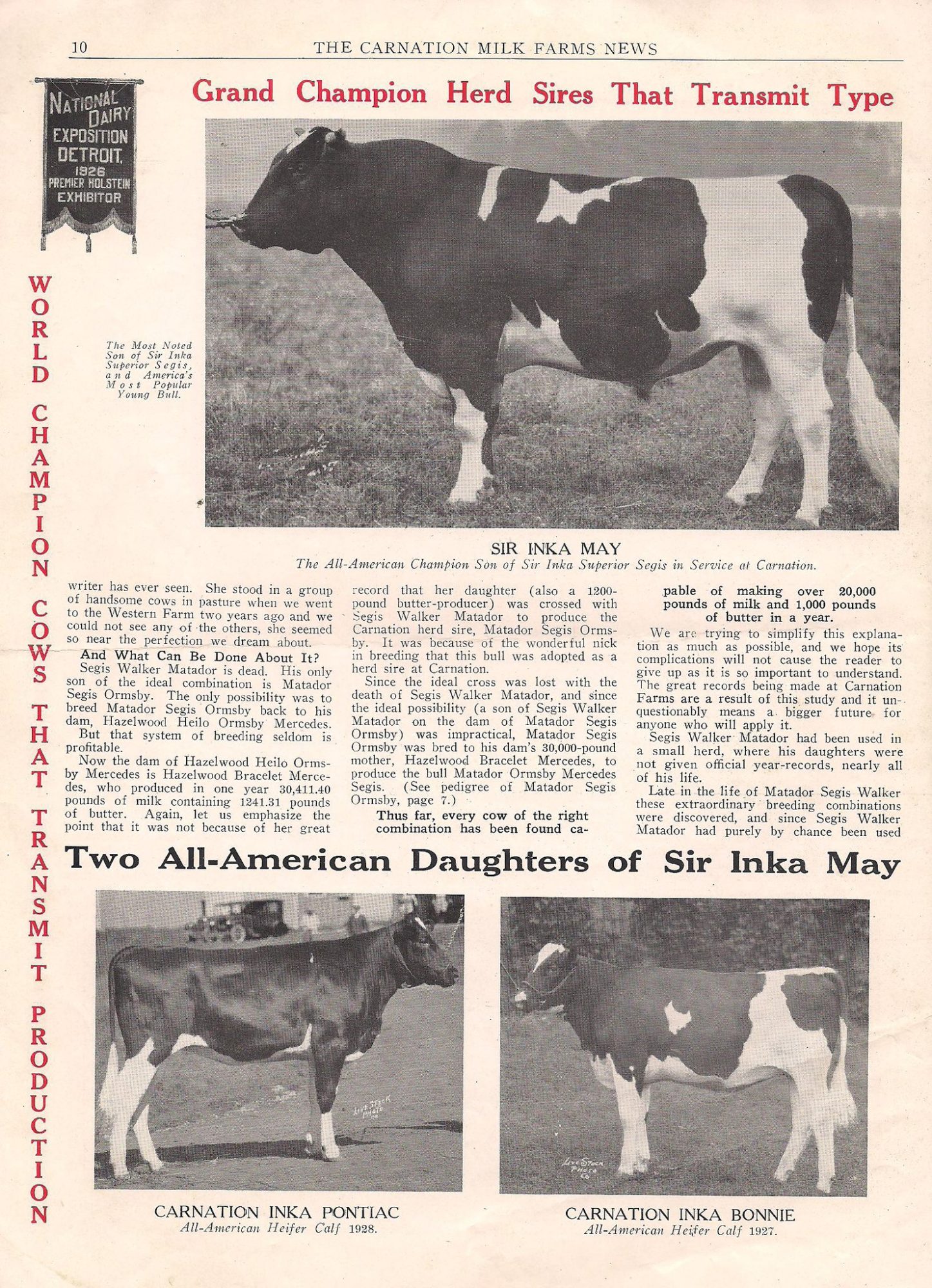 Sir Inka May featured in a 1927 issue of The Carnation Milk Farms News—pitched as the All‑American champion sire whose daughters and All‑American heifers, Inka Pontiac and Inka Bonnie, were proving that one Minnesota bull could stamp both type and production across Carnation’s herd.