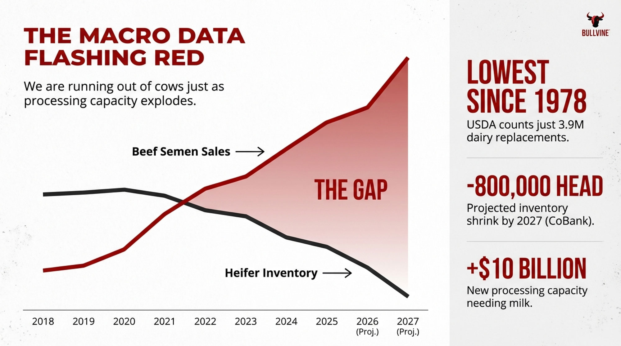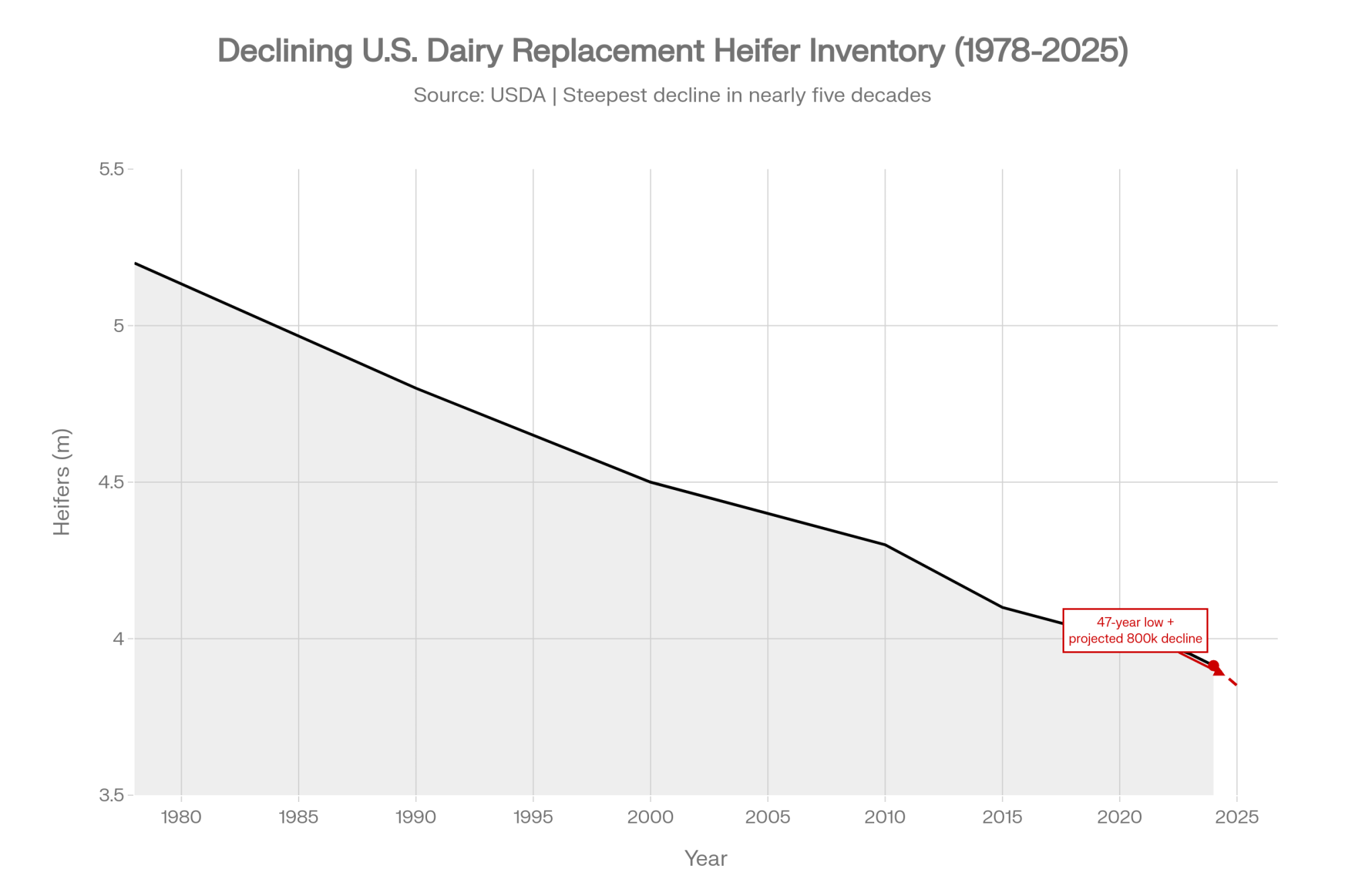 - The beef-on-dairy math has flipped. 7.9 million beef straws went into U.S. dairy herds in 2024, but USDA counts just 3.914 million replacement heifers—the lowest since 1978—and CoBank projects another 800,000-head shrink before inventories recover near 2027.