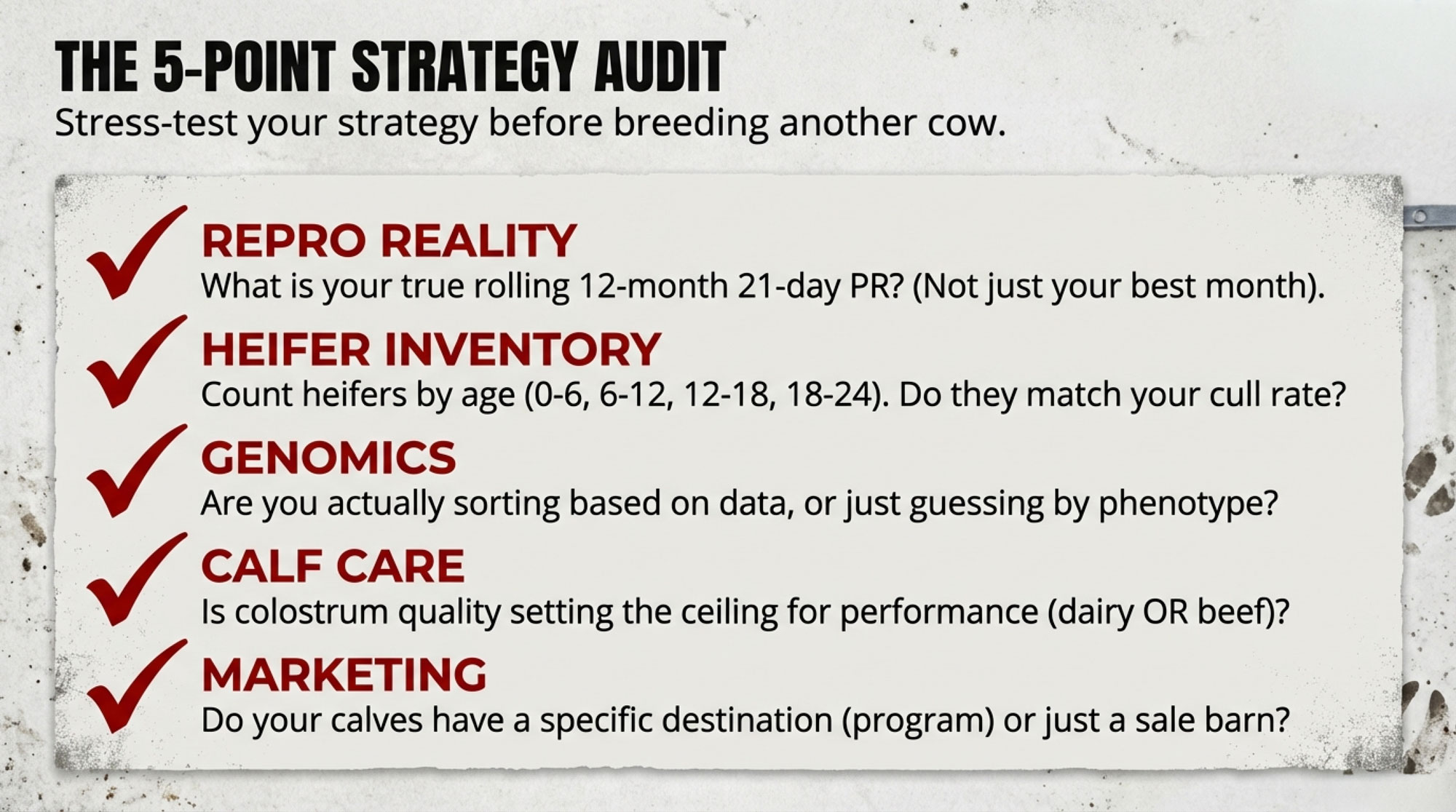 | Action This Week | Fine-tune; confirm heifer counts; adjust sexed % if needed | STOP; audit repro; model heifer shortage; plan heifer purchasing or pivot beef % down |