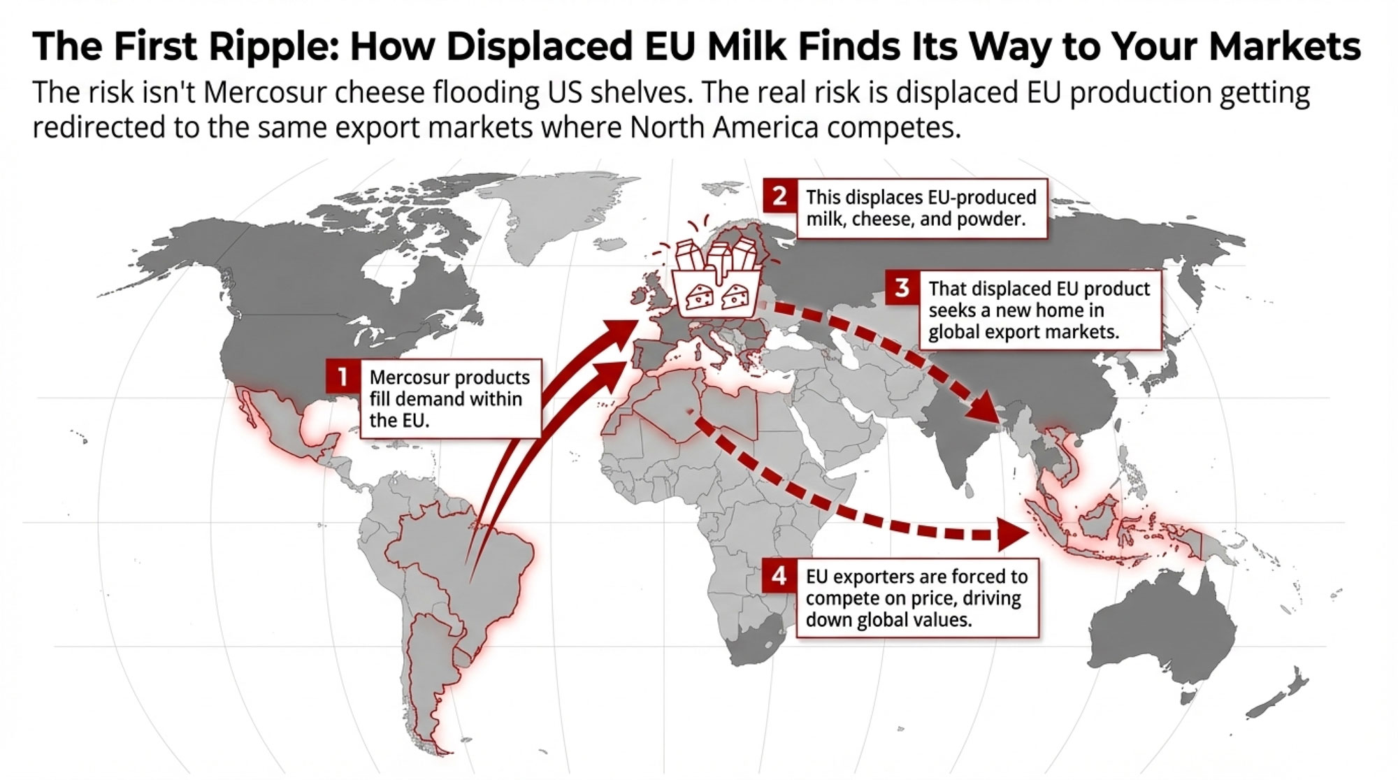 Consider the dynamics: When Mercosur beef and dairy fill European market demand, that production potentially displaces EU output that previously served those markets. But European dairy infrastructure doesn’t simply shut down. Instead, that displaced production seeks alternative export destinations—the same destinations where U.S. and Canadian dairy currently competes.